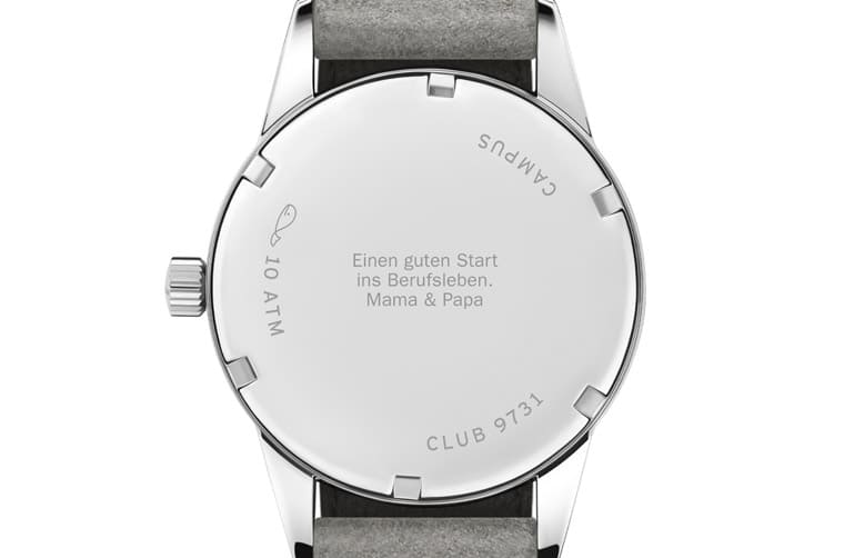 Club Campus这款作品的特色在于呈现比较运动休息的风格,而且面盘的设计也很有意思——上半部是阿拉伯数字时标、下半部又是罗马数字时标,而不管哪种数字的时标,它们都会被涂上Superluminova夜光物料,手表即使处于黑暗环境下而是能够清晰显时。此外Club Campus的实底盖设计确保手表拥有100米的防水性能,而且底盖还允许表主可以客制化文字,鐫刻上对自己有意义的资讯在手表上,强化手表的专属魅力。