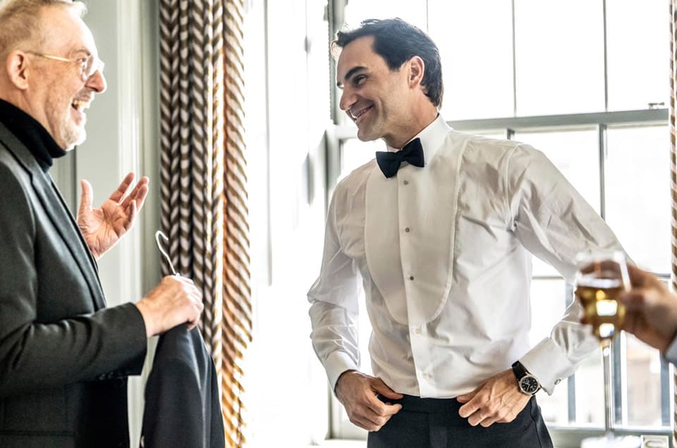 ▲费德勒在晚宴前试穿服装,手上已经戴好劳力士今年的最新正装表。Source:Facebook @Roger Federer