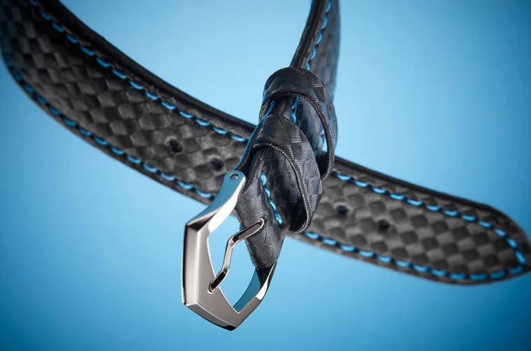 ▲不只面盘上有碳纤维编织纹,就连皮革表带外观也做成类似的纹路,光看外表就会觉得手表戴起来应该比较轻盈。
