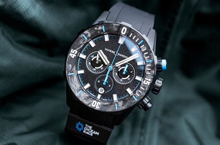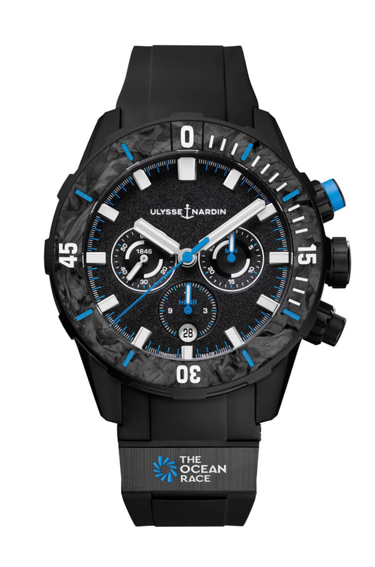 而雅典表2023年为了庆祝世界环球帆船赛(The Ocean Race)迈入50周年,所以特别设计了Diver潜水系列世界环球帆船赛计时码表。表款採用直径44毫米的喷砂黑色DLC镀层钛金属表壳,单向旋转表圈以Carbonium®碳正离子材料打造,生产过程比起传统制作碳复合材料更符合环保要求。手表的黑色面盘搭配蓝色细节展现源自大海的设计灵感,而透明底盖中央印上大大的数字”50”,清楚交代手表的创作渊源。