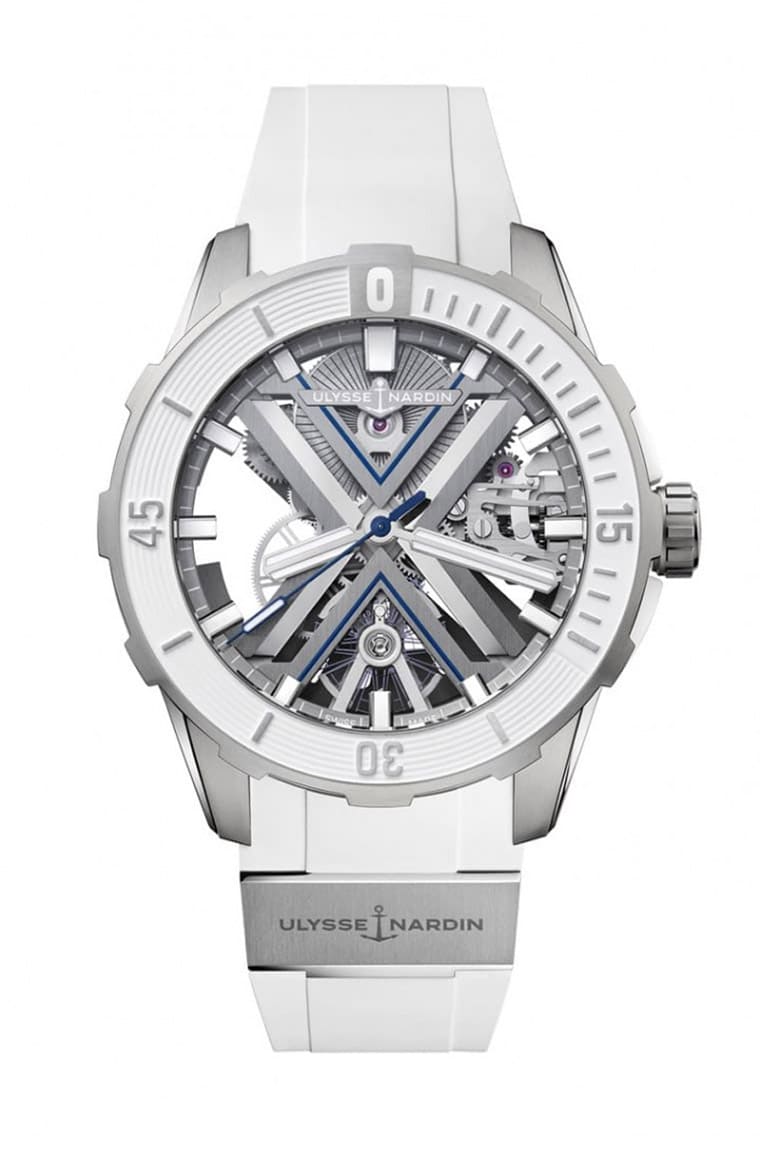 同样源自Diver系列的雅典表新表还有Diver X镂空表,表款的单向旋转表圈表面覆上白色橡胶,与白色橡胶表带(搭钛金属摺叠表釦)共构出一派洁净清新的视觉印象。表款面盘的镂空结构露出一个大大的”X”造型,镂空处理、桥板也是做成有切面的立体造型,同时雅典表也呼应秒针的顏色,在X型桥板的上下V型地带勾勒出两条蓝色线条。机芯搭载的UN-372机芯摆轮震频达3Hz,动力储存达96小时,让人难以相信这是一款镂空处理的作品所能拥有的动力水准。