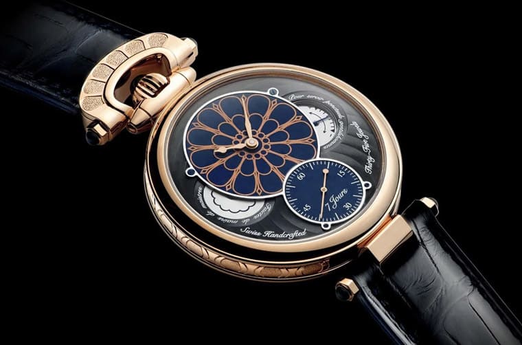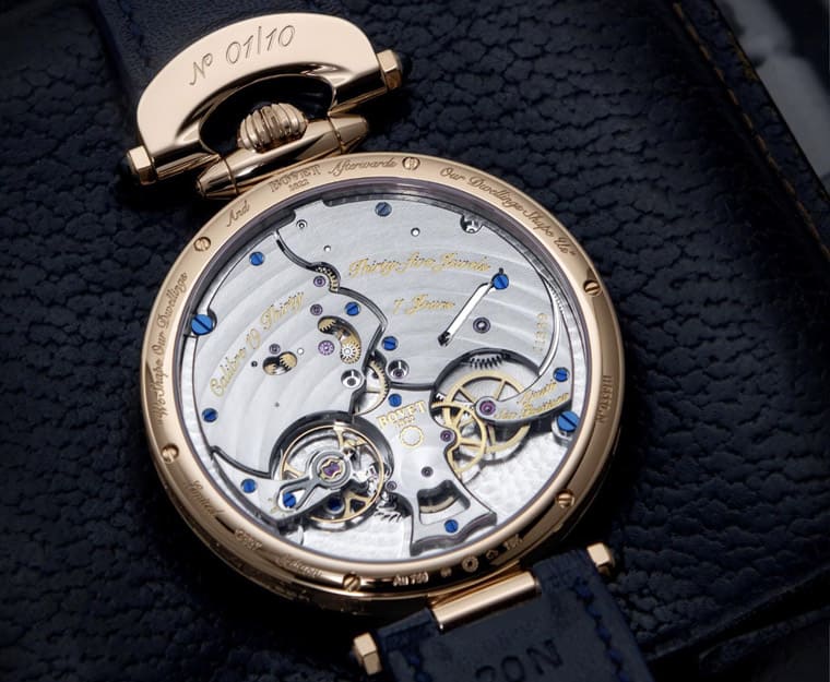 手表搭载15BM04手上链机芯,由于机芯直径达35.53mm,因此它可以容纳的发条长度也更长,使得19Thirty OWO特别版的动力储存达到7日水准,可从面盘3点方向的动力储存显示追踪手表的动力消长情况,至于机芯本身的工艺也是没话说,夹板上有鱼鳞纹、底板上有环型日内瓦波纹,品牌还用蓝钢螺丝来固定机芯的板件,精致的质感完全展现出高级制表的水准,虽然是「赠品」,但是BOVET可是拿出了看家本领来制作,这绝对会让那些大手笔入主OWO公寓的业主收到礼物时喜出望外。