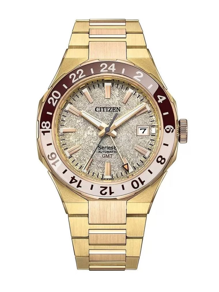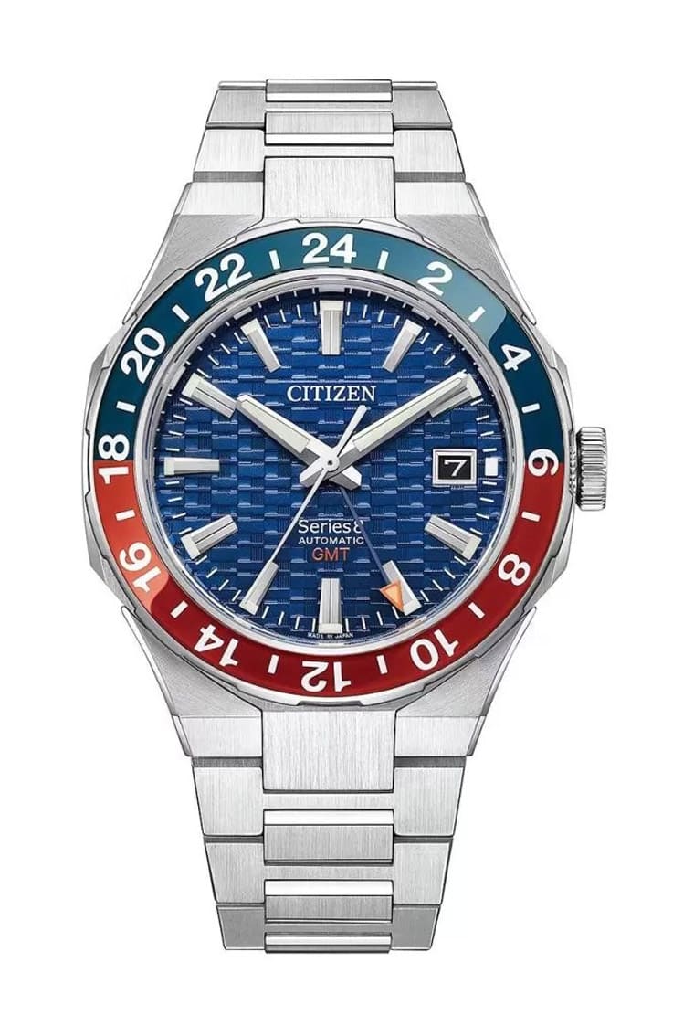 不过相较于CITIZEN是否展现更有高级制表氛围的工艺,我们其实是先被这些Series 8 GMT手表的外型所吸引。这款新作的表壳以不锈钢制成,表径为41mm,品牌首先推出的作品有三款,分别是蓝红双色表圈配蓝色面盘、蓝黑双色表圈配黑色面盘,以及表壳和链带镀成金色、採用棕色与米色双色表圈、搭配不规则雕琢纹路的黄金面盘,是不是觉得有点熟悉?光看表圈的配色就会让人想起某知名”R”牌的百事圈、蓝黑圈与沙士圈两地时间手表。