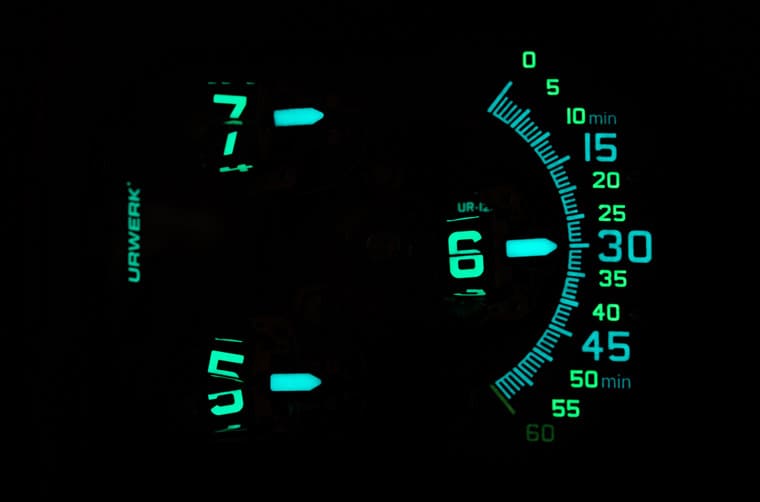 UR-120 Space Black显示的时间单位仅时、分,不过无论机芯结构或是呈现在佩戴者眼前的方式都格外繁复与奇特。手表面盘右侧设有60分钟刻度,至于小时显示就是靠着卫星转头运行到分钟刻度旁边后开始那一个小时的走时行动,小时转头同时具有分针的功效,共有三枚小时转头安装在机芯的恆星齿轮上,每当当前的小时转头走完60分钟历程后,小时转头会逐渐分岔成V字形——此为卫星转头系统的革新变体,分岔后的转头一直到即将进入到下个小时的指示后才会「合体」预先翻转至下一个小时的数字,周而复始地上演这场华丽的走时大戏让人看得嘖嘖称奇。