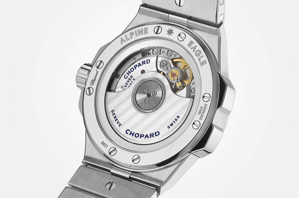 33mm和36mm的Alpine Eagle都是搭载萧邦自制的09.01-C自动机芯,在表背的透明底盖下可以清楚窥见机芯结构与零件作工。这枚机芯的自动盘和底板都有日内瓦波纹修饰,另外零件的边角也经过倒角拋光,展现高级制表一丝不苟的职人精神。而在规格部分机芯的震频为25,200vph(3.5Hz)属于相对罕见的设定、动力储存42小时日常佩戴也够用无虞,而且它还具备停秒功能,佩戴者因此可以更准确地对时;提到走时精准度,09.01-C机芯遵循萧邦的优良传统,获得COSC瑞士天文台认证确保其品质与稳定性,在萧邦旗下各款自制机芯中,09.01-C直径仅20.4mm属于体积数一数二小的作品,放眼表坛相同尺寸与功能的自动腕表,09.01-C机芯的水准绝对足以排进前段班行列。