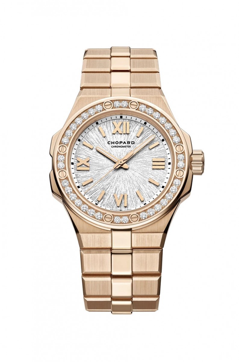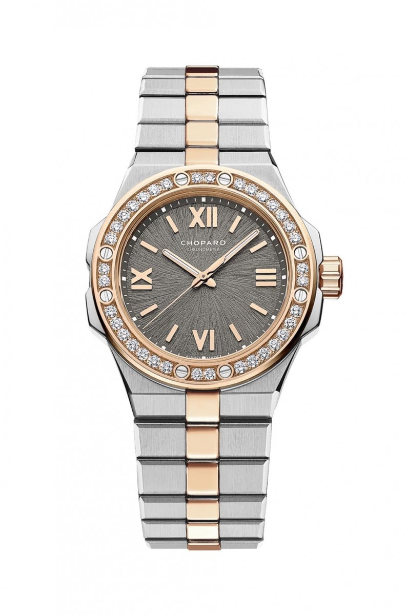 萧邦採用独家Lucent Steel A223精钢材质打造出两款Alpine Eagle 33腕表,其中一款表圈镶钻、一款则无。Lucent Steel A223精钢比起一般精钢不仅坚固性高达2倍,内部成分中更有高达7成比例是用循环再造材质,生产过程中对于环境的友善程度明显更高。品牌另以符合伦理道德标准的18K玫瑰金创作出两款Alpine Eagle 33腕表,虽然两款的表圈都有镶钻,不过其中一款的链带錬节额外镶有美钻、面盘上也有局部时标镶上钻石替代。还有两款则结合Lucent Steel A223精钢和18K玫瑰金形成双色效果,其中一款也在表圈镶上钻石,呈现更为高贵的个性。三种材质的Alpine Eagle 33腕表分别搭配不同顏色的面盘,如Lucent Steel A223精钢款为阿莱奇蓝色面盘、双色款为贝尔尼纳灰色面盘,18K玫瑰金款一只为瓦尔斯银灰色面、链带和时标镶钻款则是换上朝霞粉色面盘,同中求异的设计开创出腕表的多变个性。