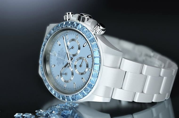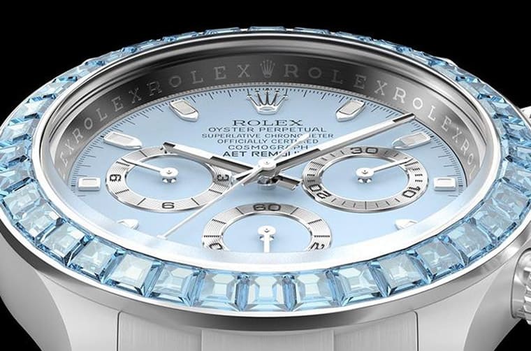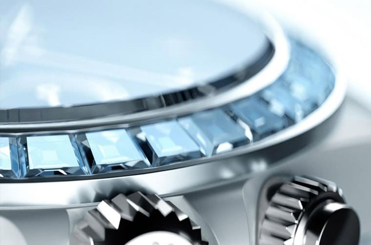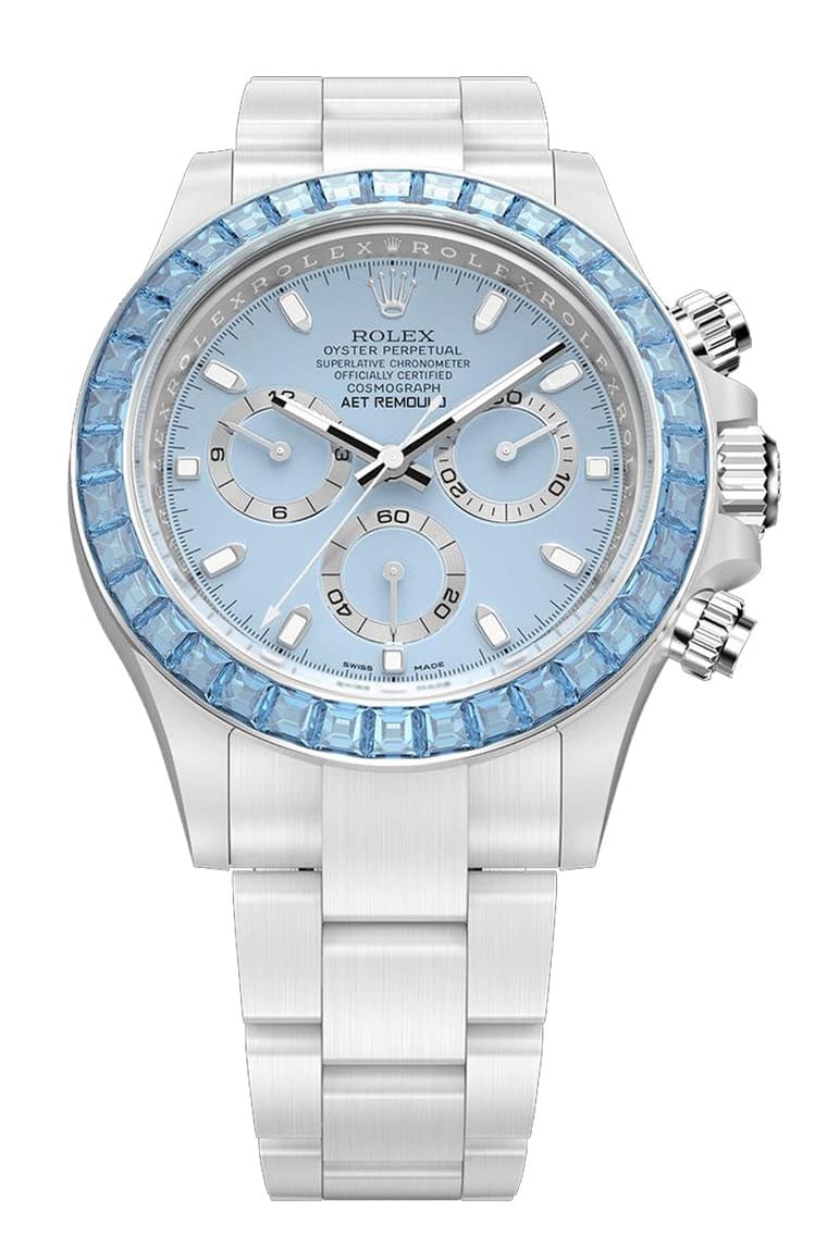 AET REMOULD特别提到他们在这款Daytona Blue Gemstone Ceramic的「铂金」表圈镶上36颗阶梯式切割海水蓝宝石,这代表改装表品牌在设计初期可能是拿铂金材质的Daytona来改装,如果真是如此,那这样的改装表制作成本还满高,光是要入手铂金Daytona来改就是笔不小的开销。AET REMOULD提到每一颗镶嵌在表圈的宝石都经过仔细筛选,目的是要确保它们的尺寸、净度、顏色和切割角度维持高度一致性,如此呈现在手表外观看起来才不会有宝石各自为政的凌乱感,从手表成品看来,显然足以证明改装表品牌的宝石镶嵌工艺有好几把刷子。
