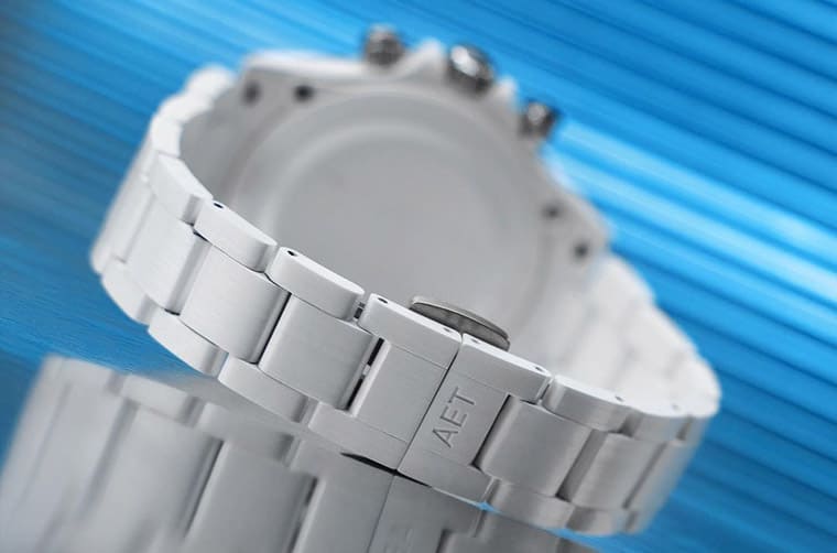 ▲AET REMOULD新作Daytona Blue Gemstone Ceramic採用白色陶瓷制作手表的表壳与链带,塑造出耳目一新的视觉效果。Source:AET REMOLD