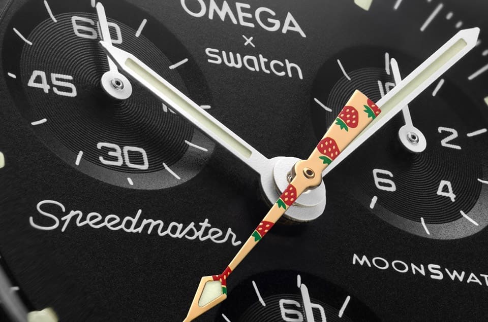 来到2023年7月,Mission to Moonshine™ Gold开卖日选在3号,换句话说也才刚刚结束不久,这次品牌又把销售地点增加至全球82个城市共96间SWATCH专卖店(台湾的西门与台北101店从上个月起都已入列),从品牌IG限动的实况记录来看,又有许多表迷前往圆梦,大家开心拿着自己刚到手的MoonSwatch拍照留念,至于这次的Mission to Moonshine™ Gold已经是连续第三个月出现新的设计元素,拿到表的表主会惊喜地发现镀Moonshine™金指针印是了许多草莓图案!刚看到指针上的草莓图案不免感到困惑这是哪招,但根据品牌解释,这是因为2023年6月的满月在美洲有着「草莓月」的称呼——每当六月满月时,现在美国东北部的Algonquin原住民部落将其称为「草莓月」,这个典故遂成了SWATCH这次的设计灵感。