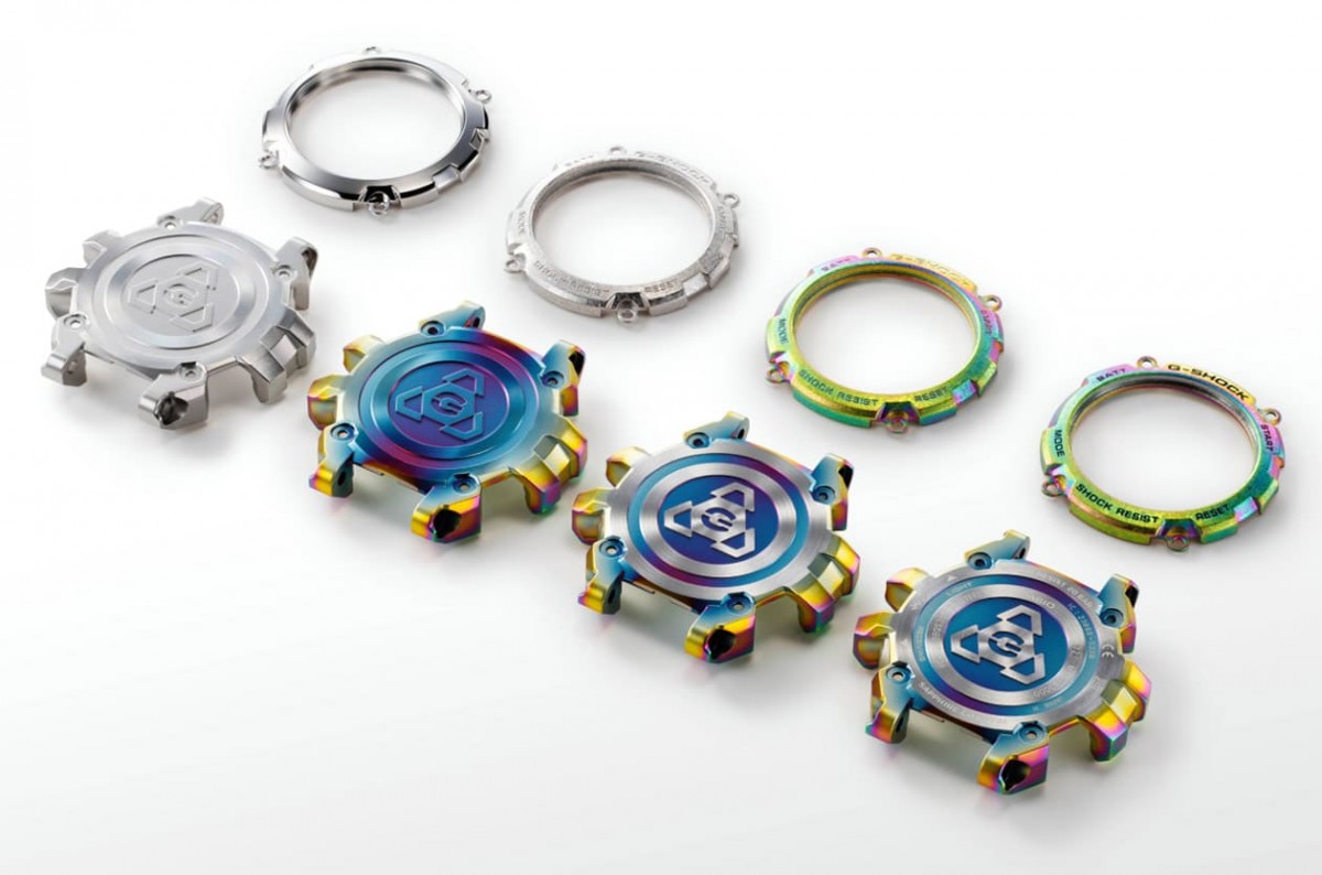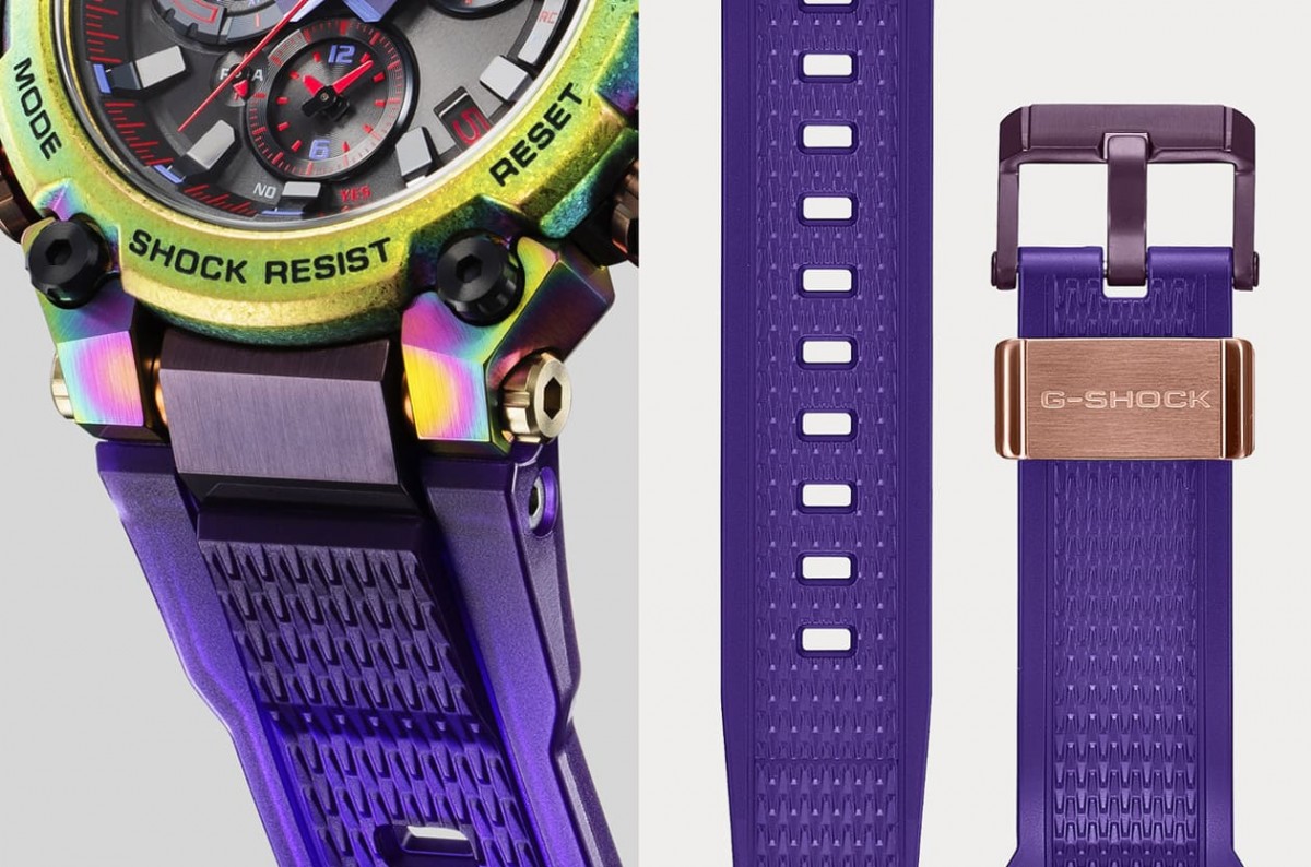 很多人一定会很好奇G-SHOCK如何制作出MTG-B3000PRB的表壳七彩效果,大致而言品牌在制作过程中会在不锈钢零件上多加三道工序,包括再结晶技术、深层硬化处理,以及最后但也最关键的彩虹离子IP镀膜处理,因此表壳才能呈现迥异于传统金属的光泽,进化至罕见的幻变彩色境界,随着不同角度、光线,表壳光泽也会有相应的变化,让人看得大饱眼福。腕表底盖一方面延续表壳的三道加工工序形成虹彩效果,不过G-SHOCK精心将底盖突起处再重新拋光直至金属「回复」成原本的银白色泽,如此一来形成彩色-银色的双重色调,使其视觉层次更臻丰富且具可看性。
