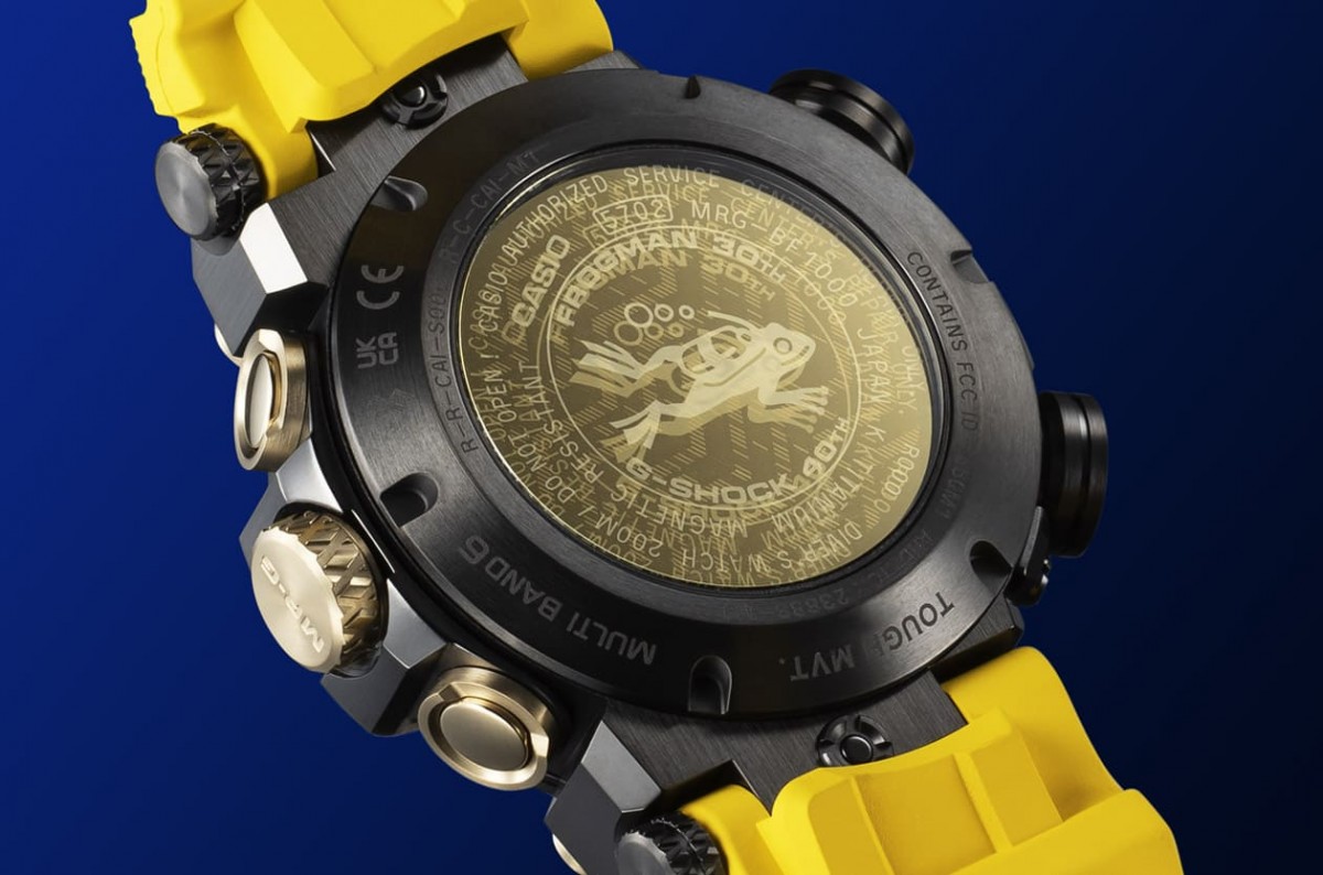 2023年除了是G-SHOCK创立40周年的大日子,品牌旗下着名潜水表Frogman蛙人系列也迎来问世30周年纪念,为此G-SHOCK特地打造一款MR-G新作MRG-BF1000E全球限量发行。腕表以现代的顶级蛙王MRG-BF1000R为基础,配色则是重回Frogman系列刚出道时经典型号DW-6300的黄、黑组合,从腕表内外讲究的设计与规格,突显G-SHOCK顶级潜水表的王者风范。
