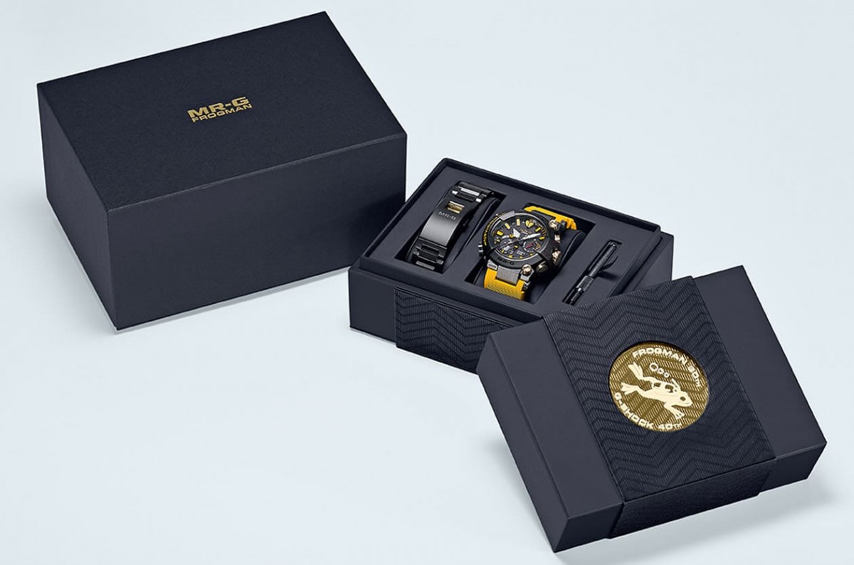 ▲MRG-BF1000E拥有特殊设计的黑色外盒包装,外部镶嵌Frogman纪念徽章,表盒内另附钛金属链带与快拆工具。