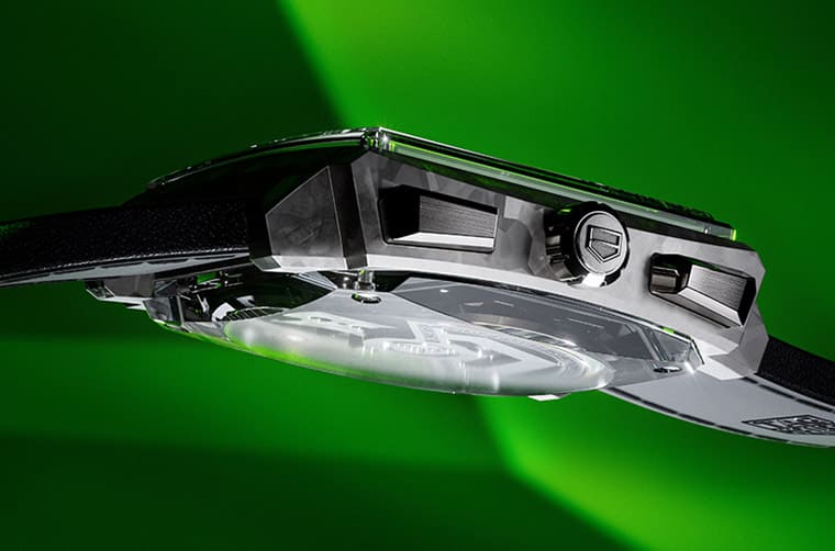 泰格豪雅此次重新调整了手表正、反面蓝宝石水晶的分布范围,有点像是把蓝宝石镜面叠在中层表壳的正、反面,因此手表的蓝宝石水晶镜面范围比一般手表更广,因为少了表圈和表背的外框设计,据品牌表示表壳结构其实设置多达4块蓝宝石水晶零件,因而创造出手表正反面更宽广、立体的视觉张力。泰格豪雅制作中层表壳的材质为Texturised Titanium这种成分特殊的钛金属,它的外观具有不规则纹路,有点像是顏色偏浅色调的碳纤维的感觉,除了视觉效果强烈,Texturised Titanium也强化了表面硬度,代表表壳更耐磨耐刮,提供手表更优异的保护效果。