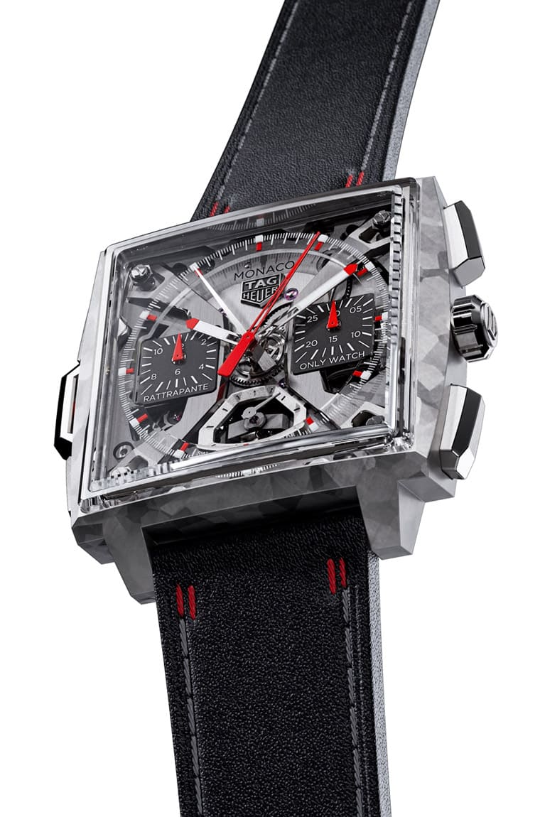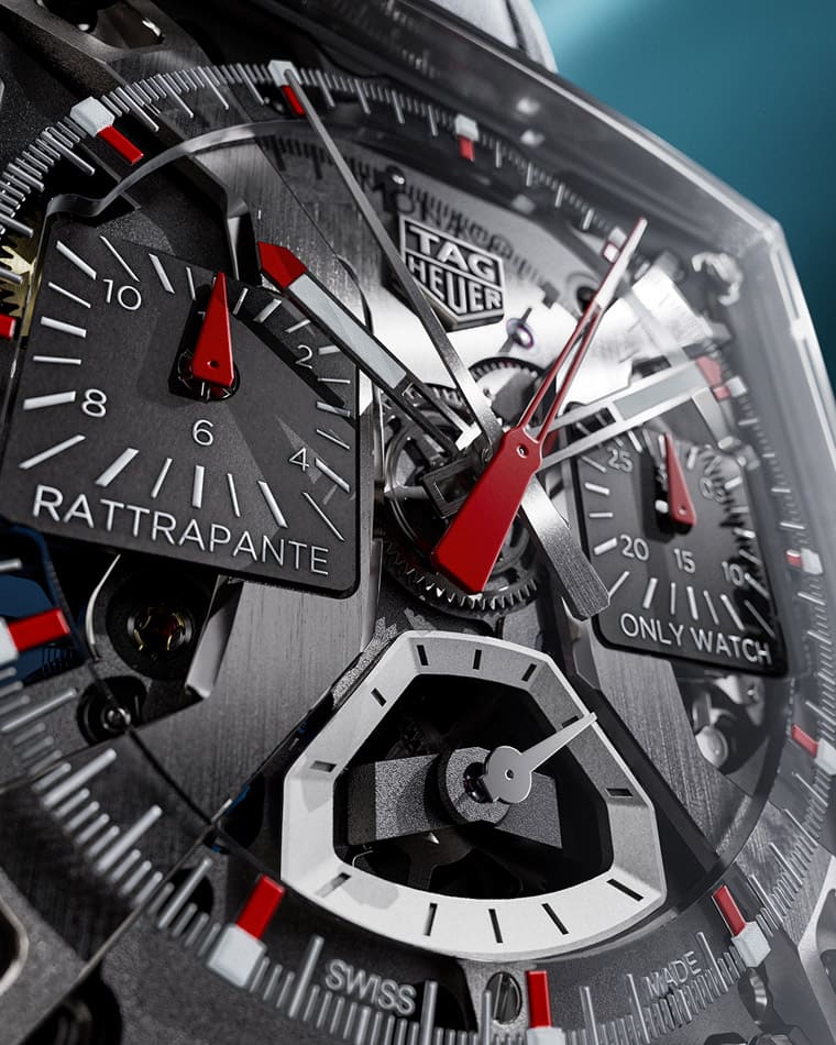 Monaco Split-Seconds Chronograph Only Watch 2023特别版的面盘採用开面设计,呈现密致的机芯构造,不过大致而言手表还是维持了Monaco的三眼表盘格局,包括3点方向的计分盘、6点方向的小秒盘和9点方向的计时盘,同时面盘中央轴心除了时、分指针之外,还有两枚计时指针负责双追针计时,这样的设计和市面上其他追针计时码表大同小异,不过这款表由于表壳构造比较特别,又是採用开面设计,所以视觉上呈现的效果会更复杂。值得一提的是,3点和9点方向的黑色小表盘下缘分别印上”ONLY WATCH”和”RATTRAPANTE”字样,直接将手表的特殊意义以及功能性传达得清清楚楚。
