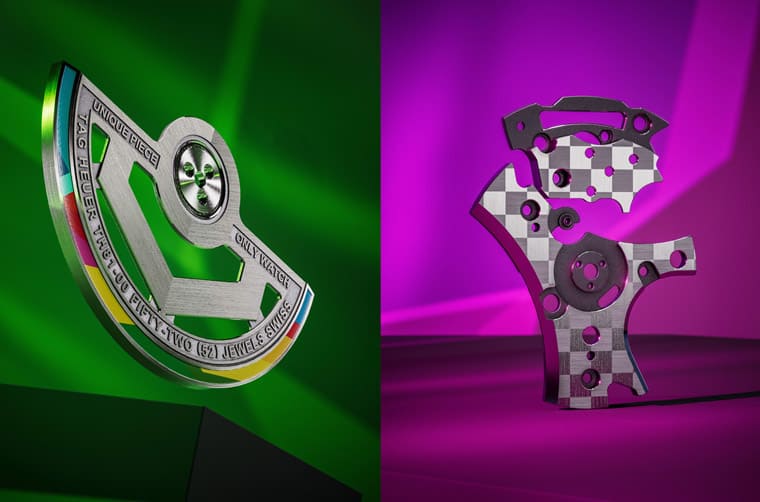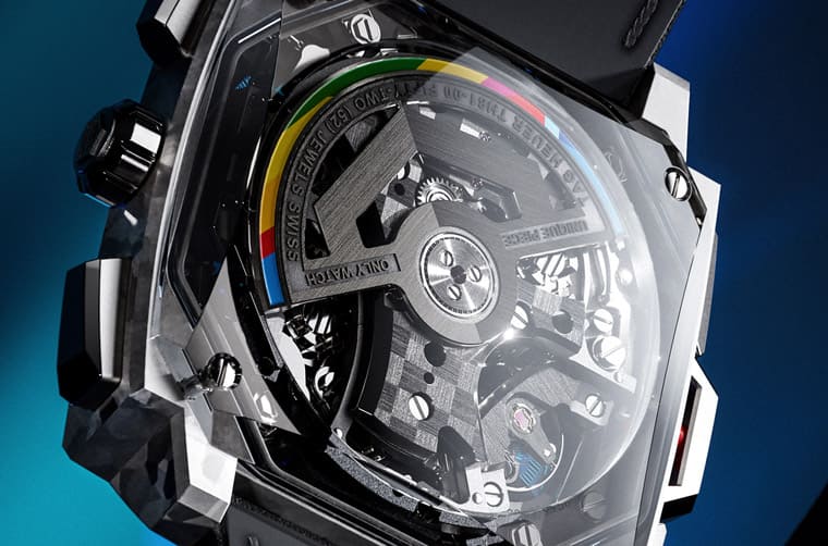 表背整片的蓝宝石底盖露出的是泰格豪雅团队与知名的Vaucher机芯厂合力研发的双追针计时机械机芯TH81-00,这枚机芯的零件全以钛金属材质制作,号称品牌历年来制作过最轻的自动计时机芯,为了慎重其事,品牌又找来新兴的独立制表工坊Artime协助修饰机芯零件,例如在机板加上棋盘格雕纹、黑色拋光、切角、珠纹与缎面打磨等等,光是机芯零件的加工修饰便要花费12小时的工时,其中泰格豪雅为了和本届Only Watch拍卖会的主视觉图案有所连结,特地邀请微绘工艺大师André Martinez在镂空自动盘的外缘以手工彩绘上红、橙、黄、绿、蓝等五彩色调,远看自动盘造型还会惊喜发现它融入了品牌Logo的盾牌轮廓,其上也鐫刻了”ONLY WATCH”和”UNIQUE PIECE”字样,致力追求尽善尽美的细节让这款表富有高度赏玩逸趣。