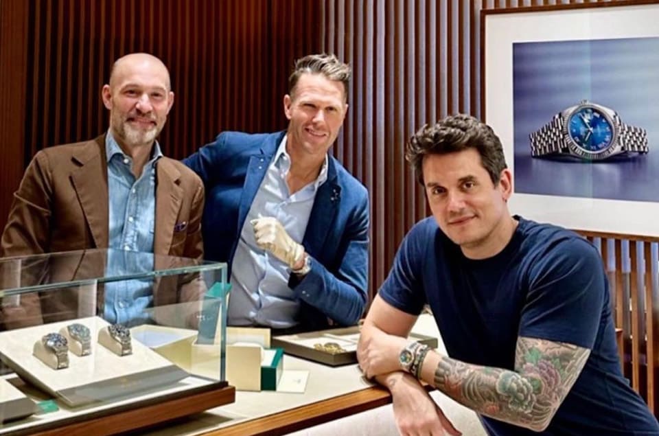 ▲John Mayer在劳力士AD店开心把玩自己最近刚入手的新表,同时手上还戴着Daytona 6263黄金款这只厉害的收藏。Source:Instagram @dearmariebr