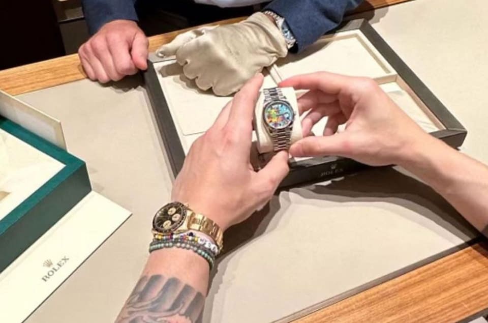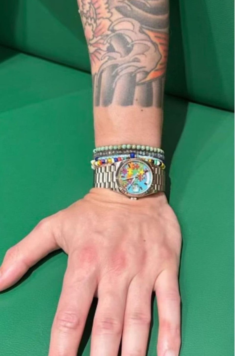 透过IG上流出的照片与影片,John Mayer前往表店买表时手上戴着Daytona 6263黄金款,同时间他正在把玩的最新收藏则是品牌2023年的话题大作Day-Date 36「珐琅拼图面盘」,这款表特色即在于劳力士採用内填珐琅工艺,将貌似拼图的轮廓图案填上五顏六色的珐琅釉料,且在面盘镶上10颗矩形切割彩色蓝宝石取代时标;另外还有个超级亮点在于,Day-Date的日期与星期显示,在这款珐琅拼图面盘上分别改成了31种特定表情符号或图案,以及七个代表正向态度的英文单字(如「Happy(开心)」、「Eternity(永恒)」等等),严格来说它的功能性反而退化了,但是加上新创意使手表变得更有特色与魅力。