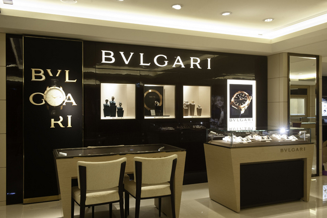 宝格丽位于富贵的店中店,特别从国外引进深色亮面烤漆展柜,整体流露出现代奢华感;精致的陈列设计,让每只手表都有最美的伸展台,完美地展示BVLGARI 的制表美学。