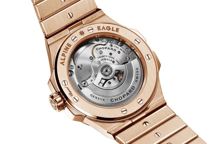▲5款玫瑰金Alpine Eagle表背都是透明底盖设计,让人可以一窥萧邦自制机芯之美。