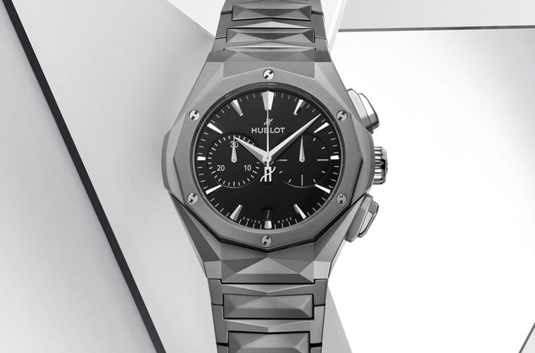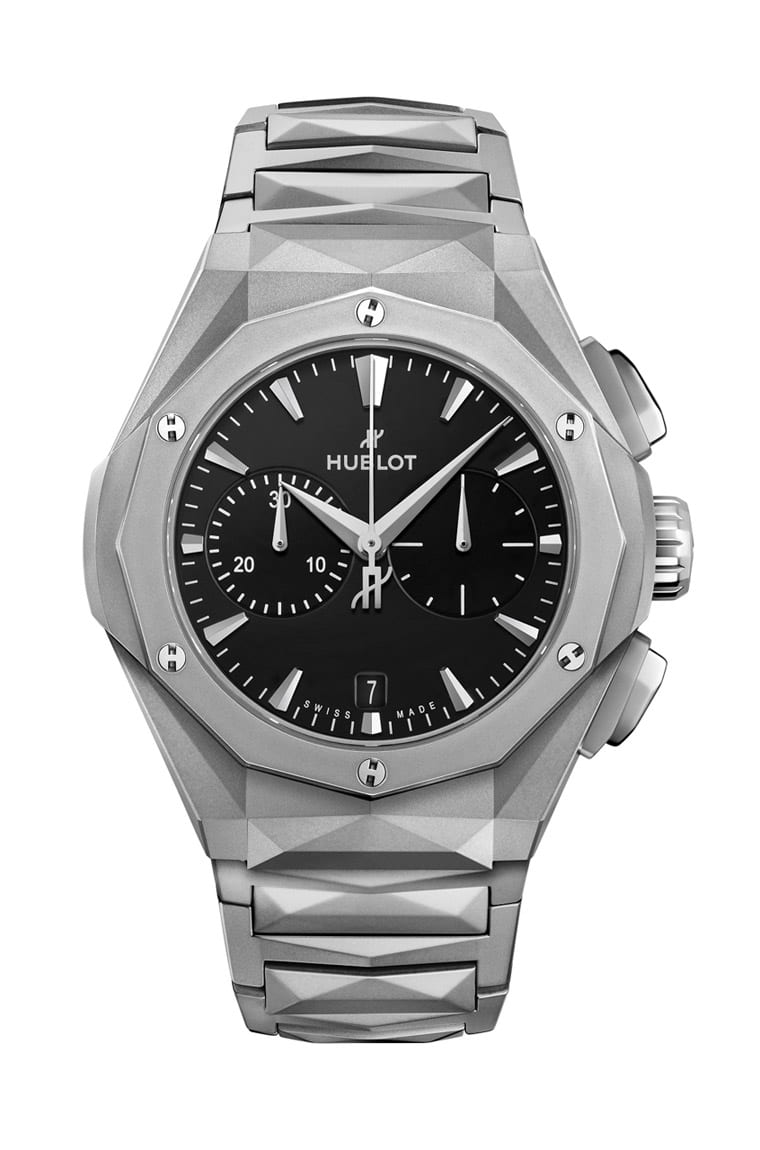 宇舶和法国雕塑艺术家Richard Orlinski合作多时,2023年双方再度带来新的作品经典融合Orlinski钛金链带计时码表。表款採用钛金属制作41mm的表壳与链带,其中链带由83枚部件组成,特殊倒角形状的链节透过精密设计紧密连结。表圈为12边多角造型。雾黑面盘映衬金属色泽的立体三角柱时标与指针,整体设计相当符合艺术家深植人心的标志性符码。手表搭载HUB1153自动机芯,除了复杂结构具可看性,也和Richard Orlinski的创作手法彼此相容,展现一般运动表难以表现的艺术风格。