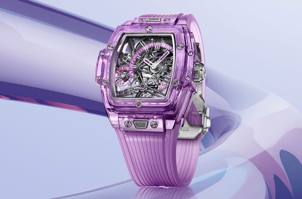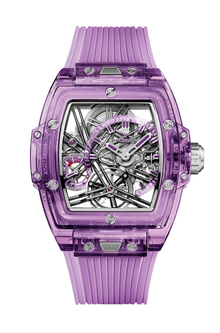 紫色蓝宝石材质/HUB6020手动上链机芯/偏心时、偏心分显示/陀飞轮装置/动力储存显示/蓝宝石水晶镜面、透明底盖/防水30米/表径42mm/限量50只/参考价:NT$ 6,377,000