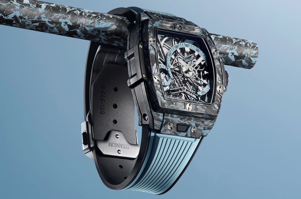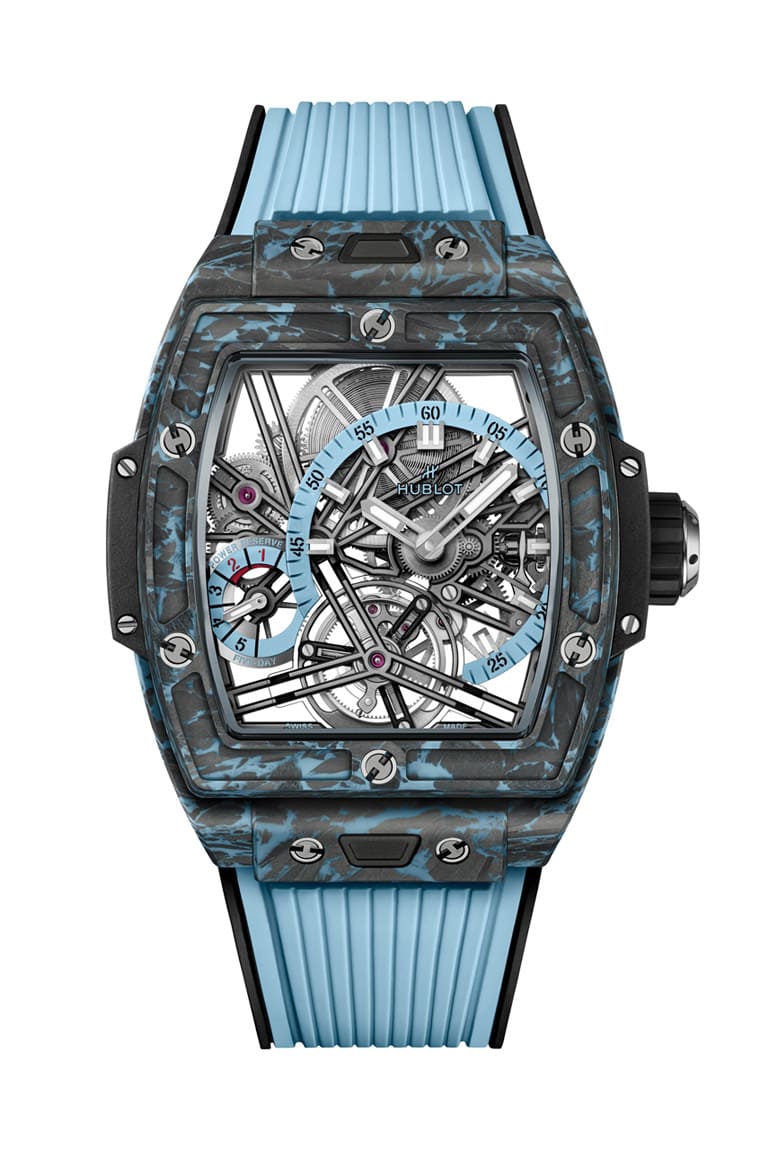 碳纤维、天空蓝微玻璃纤维材质/HUB6020手动上链机芯/偏心时、偏心分显示/陀飞轮装置/动力储存显示/蓝宝石水晶镜面、透明底盖/防水30米/表径42mm/限量50只/参考价:NT$ 3,107,000