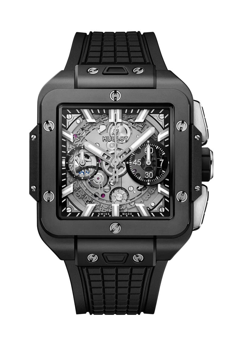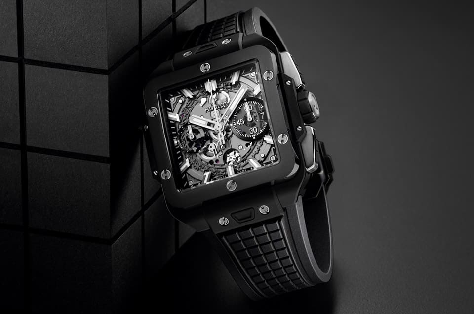 此系列为宇舶2022年刚推出的作品,来到2023年品牌再延伸出Square Bang Unico魔力黑陶瓷计时码表,顾名思义是用高科技陶瓷打造表壳,同时开面设计的面盘露出HUB1280 UNICO机芯的密致结构,机芯蕴含飞返计时功能配备导柱轮结构,动力储存也达到72小时,在透明底盖下可以一窥机芯的运作动态以及零件的精细打磨。