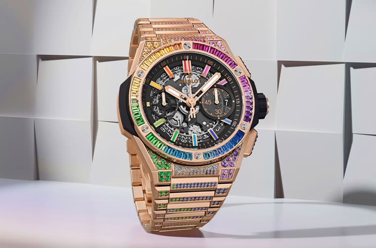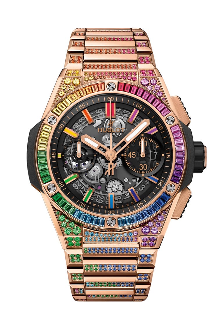彩虹圈是层峰市场爱不释手的人气元素,Big Bang Integrated皇金彩虹链带计时码表锁定这个市场以品牌独家皇金材质制作表壳,其中表圈镶嵌54颗长方形切割宝石,链带则镶嵌768颗宝石。这超过800颗的宝石包括红宝石、紫水晶、蓝色托帕石、沙弗莱石以及粉色、橙色、蓝色和黄色蓝宝石,随着镶嵌位置不同,宝石的大小和形状也会出现变化,顏色之间则呈现巧妙的渐层变化,迷人的彩色光泽完美勾勒出Big Bang Integrated一体式表壳与链带设计,华丽且美不胜收的外型让人看得如痴如醉。