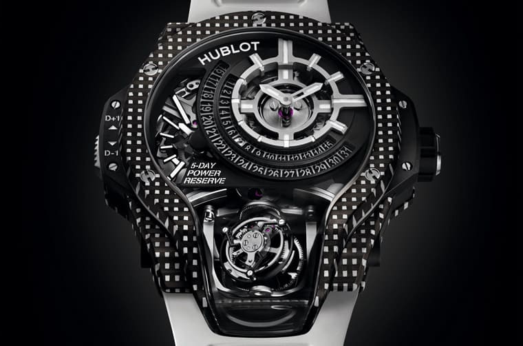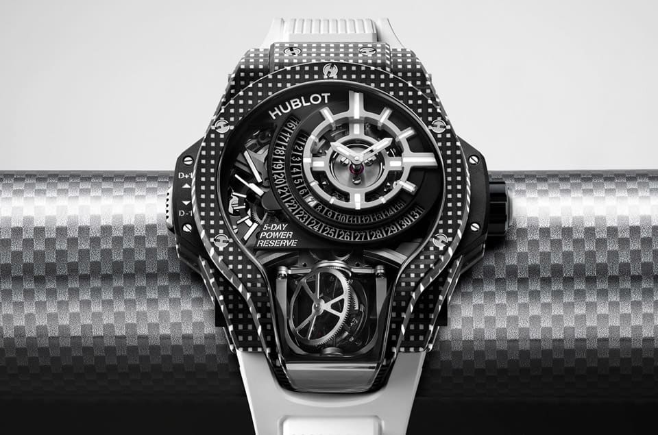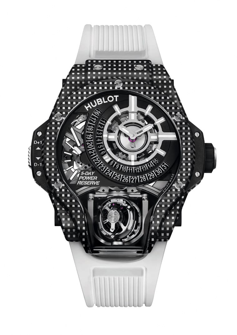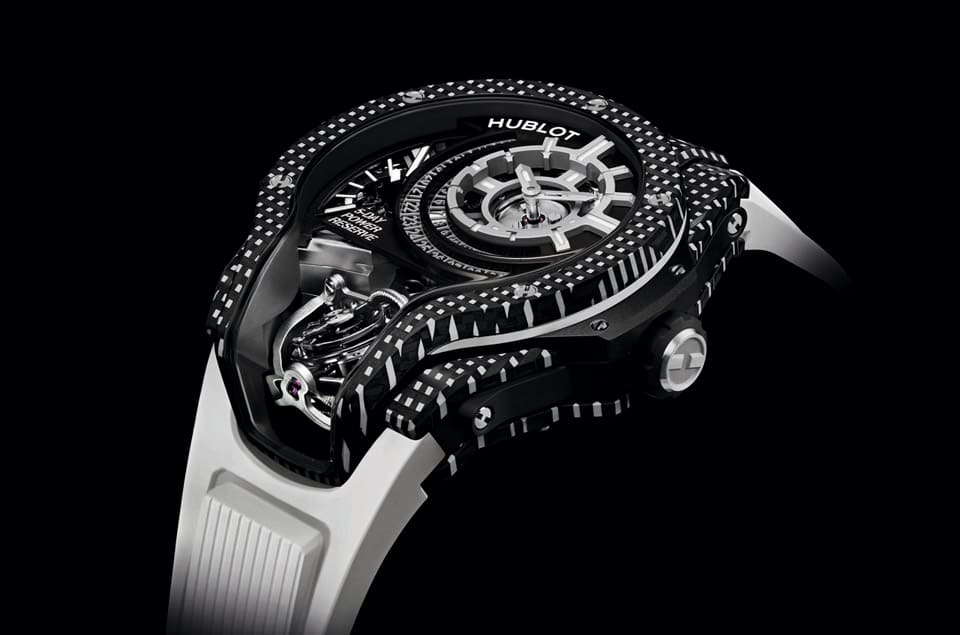 白色3D碳纤维材质/HUB9009.H1.RA.B手动上链机芯/时、分、小秒、日期显示/陀飞轮装置/动力储存显示/蓝宝石水晶镜面/防水30米/表径49mm/限量8只/参考价:NT$ 6,213,000