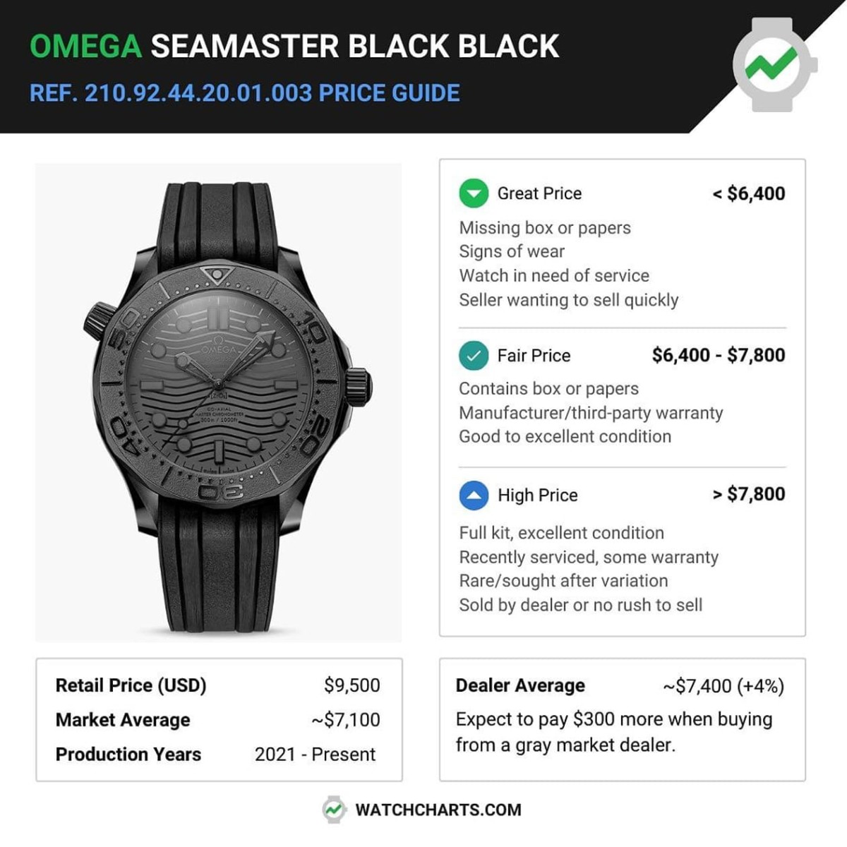 WatchCharts也补充到,根据Seamaster Diver 300M Black Black的表况、包装完整程度、证明文件是否齐全等各项因素,会导致它的二级市场价格区间介于6,400美金~7,800美金(约合台币20万6~25万1),若能用这样的价格买到这款全陶瓷的海马潜水300米手表,以它目前的市场身价都还算处于合理范围。