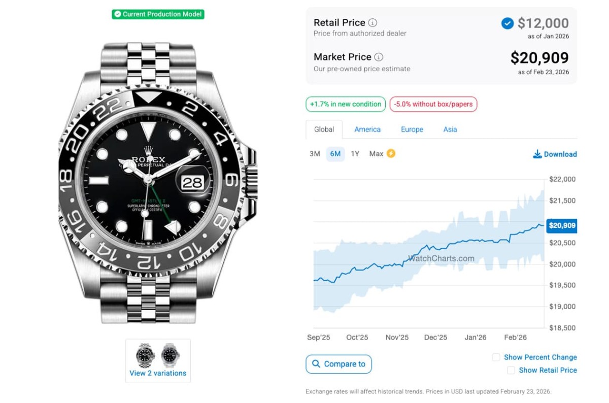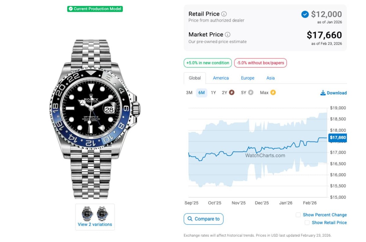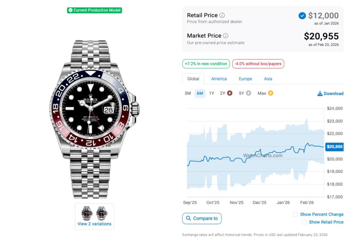 根据高级手表市场调查研究机构WatchCharts的资料在2025年8月底时的追踪,当时126710BLNR-0002、126710BLRO-0001、126720VTNR-0002和126710GRNR-0003(皆为五珠带)的国外报价分别是17,002美金(约合台币53万2)、19,472美金(约合台币61万)、16,918美金(约合台币53万)和19,610美金(约合台币61万3),已经处于二级市场热门表价格连续下滑的阶段好一阵子了;至于又过了半年左右的现在,这四款钢壳GMT-Master II爆款的身价又呈现怎麼样的变化呢?