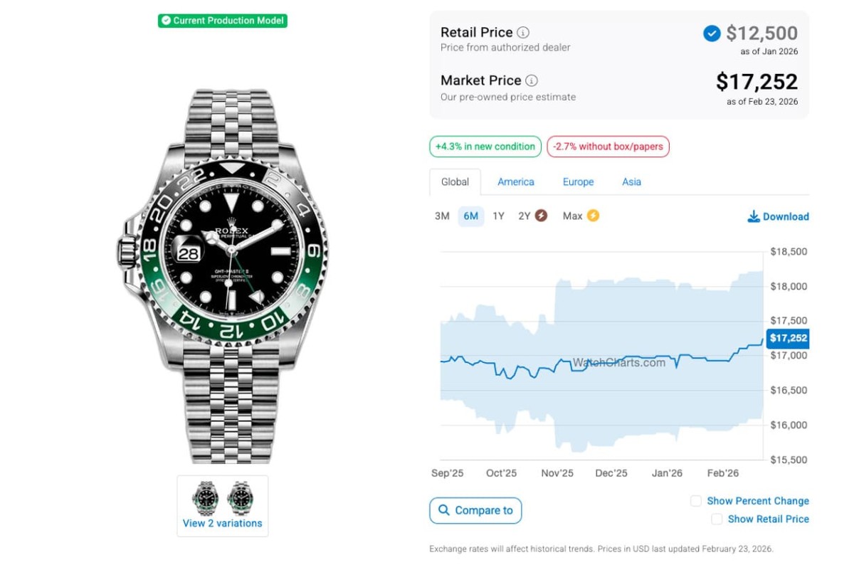 ▲绿针灰黑圈126710GRNR-0003 2026年的原厂价格是NT$ 406,500,目前的二级市场价格平均约落在65万4。Source:Rev Comps