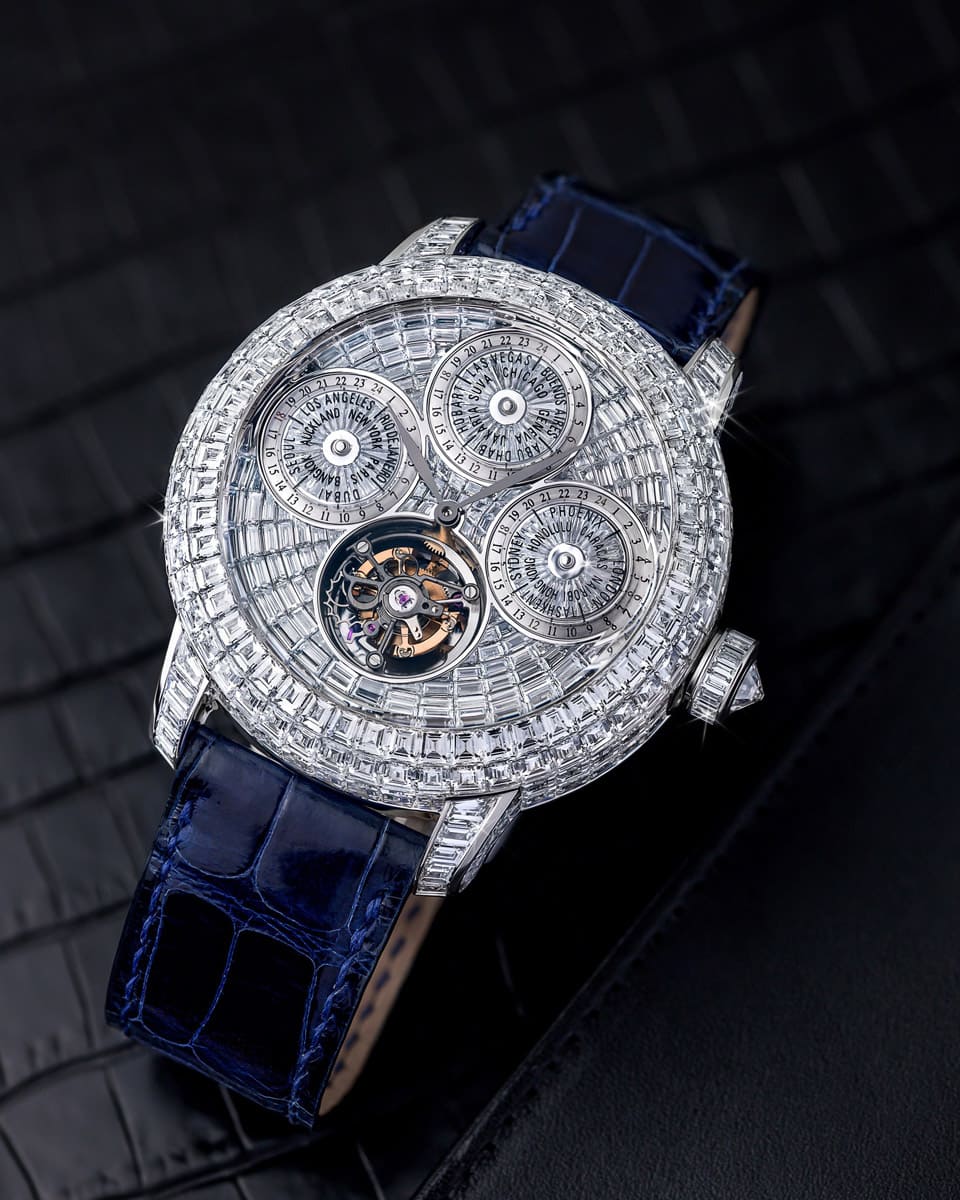 这款华丽的钻表表径达47.5mm,表壳以白金制成,表壳、表圈、表冠等处共镶有294颗矩形切割钻石,面盘也有204颗矩形切割钻石,搭配深蓝色鱷鱼皮表带优雅又奢华至极。而且手表并非只是镶满钻石很吸睛,它的功能性同样是一大亮点,面盘除了6点方向的飞行陀飞轮之外,还有三枚具备24小时刻度的小表盘能分别显示全球24个时区时间,设计和一般的世界时区手表不太一样,但是阅读时还是可以很轻松,不会受到满天星光芒的影响。手表背面可见透明底盖下方镀上蓝、红、黄等三种顏色的机芯底板,繽纷色调弥补了底板盖住大多数机芯结构的可惜感,而且这枚手上链机芯还有长达120小时的动能,对照它的复杂功能,这种长效动能就和外观镶满的钻石般令人惊喜。