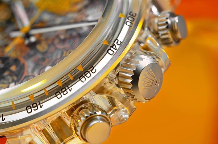 AET REMOULD用来改装”Halloween”的基础是劳力士Daytona,这个系列也是这家改装表品牌最常改造的主力作品之一。Halloween採用蓝宝石水晶材质制作表壳,因此它和原厂Daytona光是外表的第一印象就有很大差异;虽然手表的线条不变,但是视觉效果从实心的金属变成透明的蓝宝石,使人可以直接窥视内部机芯结构,而AET REMOULD也必需重新打造适合4130机芯(可见改装表品牌用的还是旧款的Daytona)的蓝宝石表壳零件,在这部分投注的心力与时间就已经非常可观。