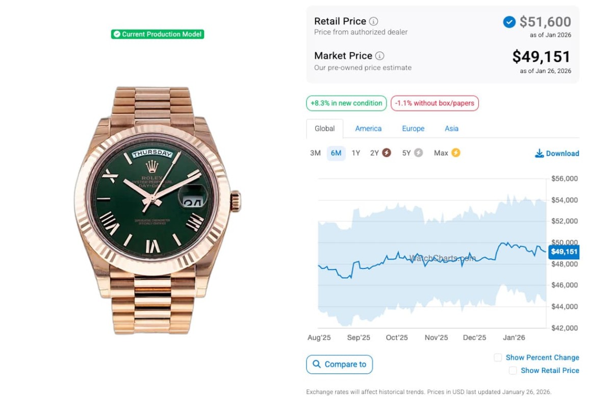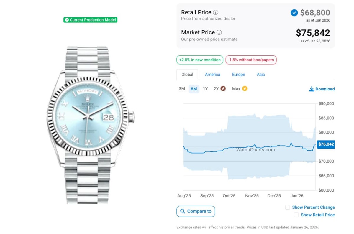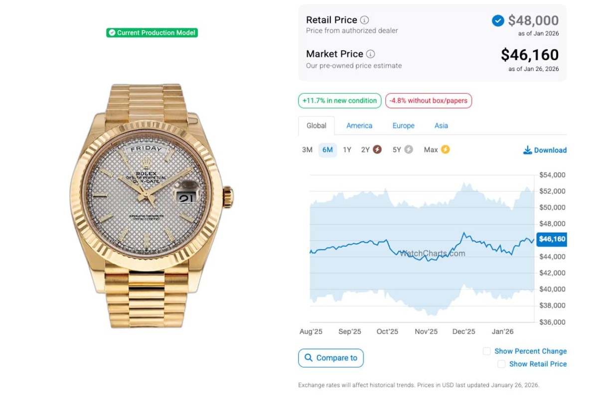 根据高级手表市场调查研究机构WatchCharts的资料,四种材质的Day-Date入门款在2025年7月时的行情分别是黄金款的44,428美金(约合台币139万8)、永恒玫瑰金款的47,867美金(约合台币150万6)、白金款的39,309美金(约合台币123万7),以及铂金款的75,318美金(约合台币237万),当时包括黄金、永恒玫瑰金与铂金总统表皆属于超定价水准,想入手这款系列旗舰作品预算要抓宽松些才有机会。