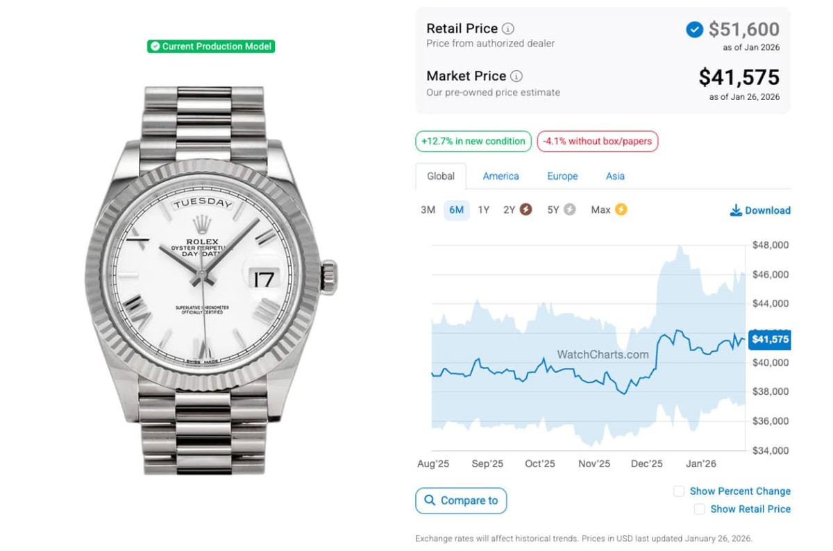 转眼到了2026年1月,过去半年以来,Day-Date 40mm的二级市场价格有起有落,不同材质之间有各自的发展,其中铂金款的发展有点戏剧化,原本在2025年2月突然气势如虹成长至短期内的高峰,然后在那之后又有点疲软下滑,尤其是4月时跌到该年谷底,近几个月来略有起伏之后一度降至比4月时更低的价位,不过10月以来又有起色开始往上爬,到目前四个月来价格还满平稳的。而一向行情较差强人意的白金款,也在2025年2月后突然冲上来,行情维持到5月,至7月为止又有比较明显的下滑,可是进入到8月后又再升起,至9月中旬到该年底原本变化也不算大,可是2025年12月到2026年初又冲高了一波起来。同样根据WatchCharts的资料,黄金、永恒玫瑰金、白金与铂金Day-Date 40mm如今的行情依序是46,160美金(约合台币145万3)、49,151美金(约合台币154万7)、41,575美金(约合台币130万8)和75,842美金(约合台币238万7)。现在除了铂金款还有超定价,其他三款都已经在定价线以内了。