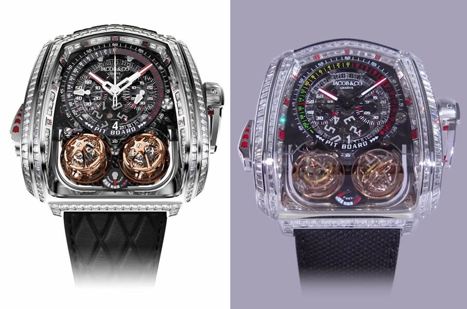 JACOB & Co.最初是在2016年推出Twin Turbo系列,当时是史上首款结合两枚三轴陀飞轮与三问功能的大复杂之作,至于首款Twin Turbo Furious则是在2018年问世,大致而言就是在Twin Turbo的基础上融入了单按把计时码表以及计时参考时间功能,将复杂度推向更高境界。品牌近年来曾与BUGATTI布加迪合作,以这款表为基础推出联名表,至于C罗指定的镶钻版本是在2019年问世,虽然18只的限量数不多,但包括钻石的筛选、镶嵌都很花时间,而且从手表的官图与一般版的Twin Turbo Furious钻表图片比较,会发现C罗应该是有提出了一些客制化的要求,例如时标改镶红宝石、计时刻度的顏色则改以葡萄牙国旗的绿、红、黄为主,这些都可能拉长了手表制作的时间。