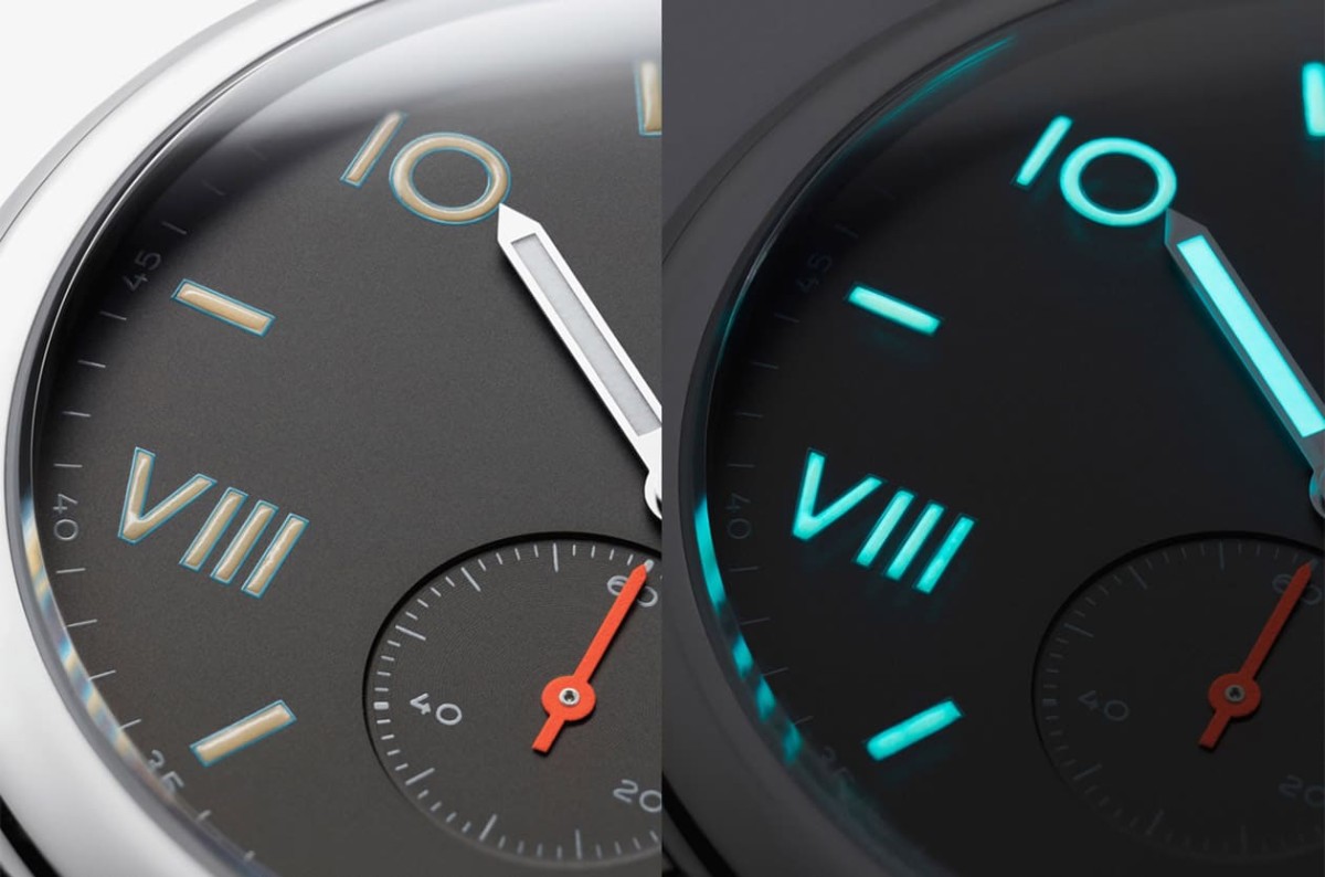 白面或黑面的Club Campus虽都採用加州面盘设计,但是NOMOS针对不同面盘顏色仍进行了细部调整,例如白面款式的分钟、小秒刻度,以及品牌Logo都是黑色,时标上的SuperLuminova夜光涂层则是绿松石色(橘色线条勾边);黑面款式恰恰相反,刻度与Logo都换成了白色,时标上的SuperLuminova夜光涂层也变更为棕色再用薄荷色描绘轮廓,呈现高度对比感以及独具巧思的配色组合,确保佩戴者阅读时间更为直觉易看,同时不同配色之间也多了足以区辨的细节特徵。