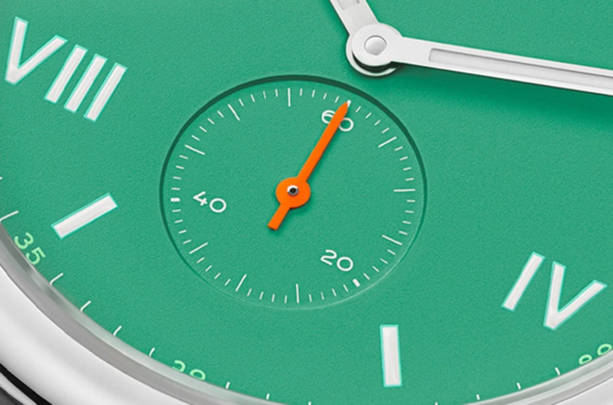 珊瑚色与电光绿两款Club Campus的加州面盘都採用薄荷色勾勒时标线条,再加上白色的SuperLuminova夜光涂层,其与时、分指针上的夜光涂层同色,也和分、秒刻度与品牌Logo维持一致色调,展现清爽且统一的风格,至于6点方向小秒盘的指针依旧为亮橘色,这是Club Campus迄今无论尺寸大小或面盘顏色如何变化都不会变动的招牌元素,撞色设计能让小秒针的运作自然吸引视线聚焦,赋予腕表强烈的时间节奏感,彷彿展示腕表的心跳一般传达内部机芯规律精准的运作。