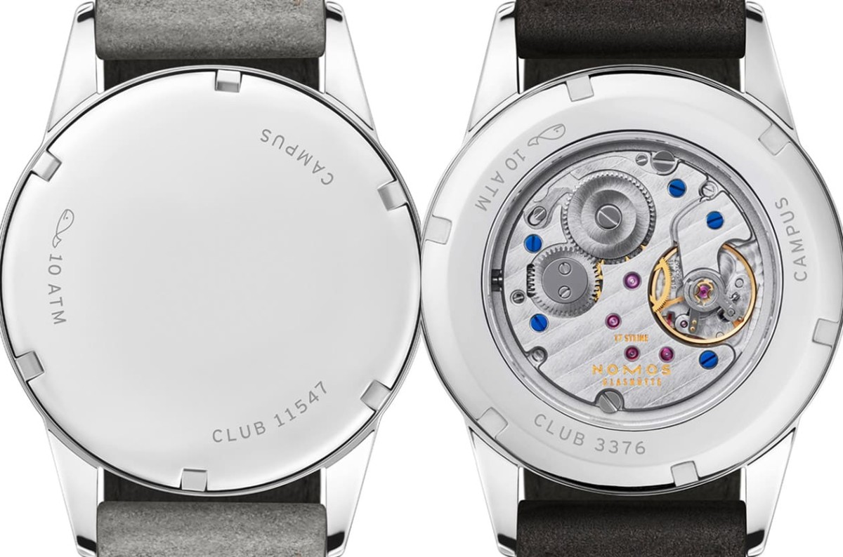 Club Campus分别有实底盖与透明底盖两种版本,两者的防水性能都达到100米水准,后者能让佩戴者愜意观赏NOMOS着名的手上链机芯Alpha,这枚机芯具备3/4夹板设计,夹板表面饰以大面积的格拉苏蒂纹,同时微调系统也属于较高阶的螺纹微调,即使机芯仅为小三针基本功能,但是从机芯零件的打磨、倒角拋光等细节,都可感受到NOMOS延续德国悠久历史传统制表工艺的坚持。