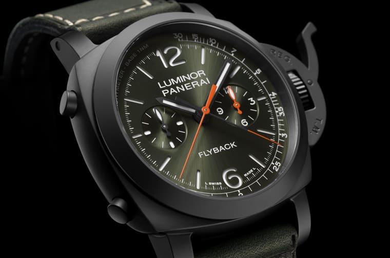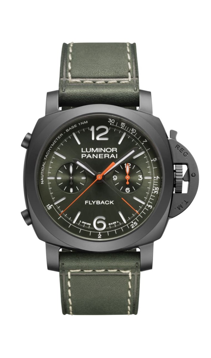 ▲以黑色陶瓷制成的Luminor飞返计时码表PAM01498,限量200只。