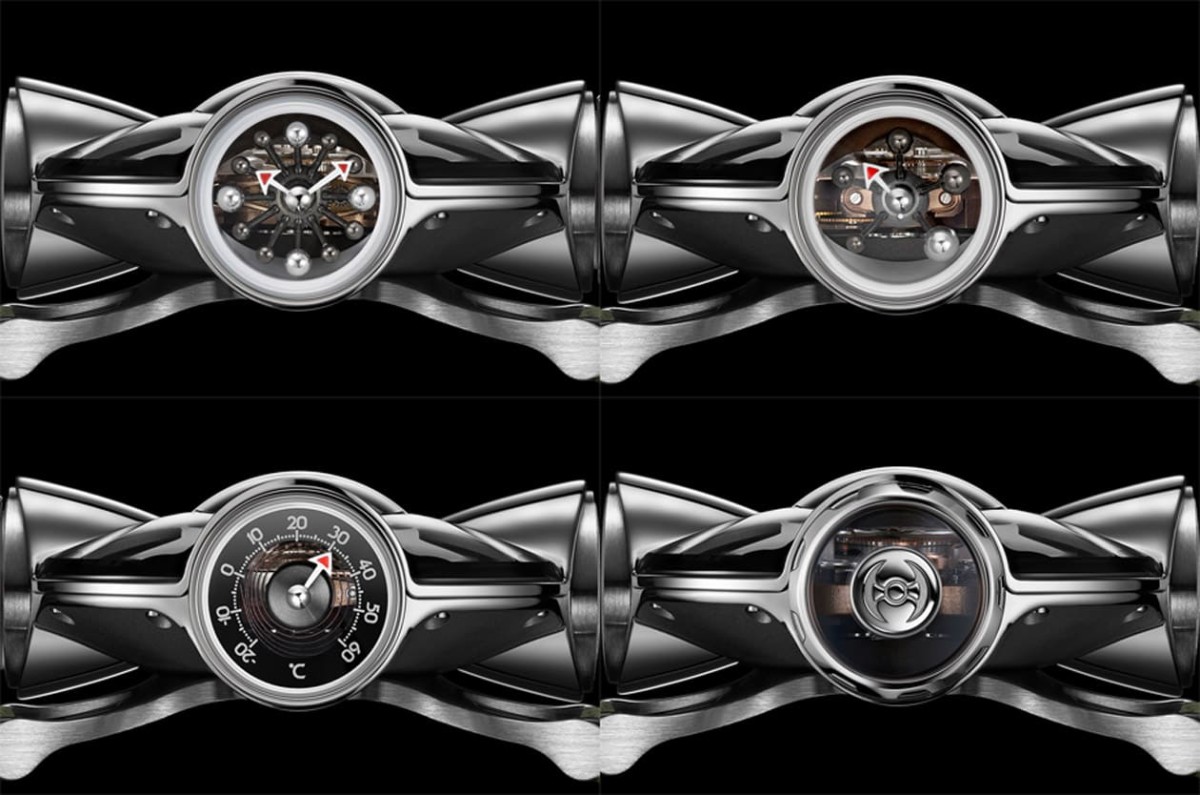 手表的四个房间各有各的作用,包括「时间房」、「动储显示房」、「温度计房」与「校时上链房」。「时间房」设有时、分指针,针尖都有红色夜光涂层,MB&F以拋光铝合金圆球作为每15分钟的刻度,其他刻度则以深色拋光钛金属圆球代表。「动储显示房」也有红色箭头指针和圆球,沿顺时针方向排列五颗圆球,它们的直径呈递增状态,最大一颗直径达2.4mm,代表手表处于满錬状态,圆球愈小颗则动力也跟着递减。