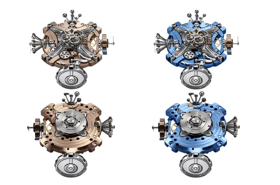 ▲HM11 Architect搭载的手上链机芯零件多达364枚,MB&F分别将机芯夹板度成淡蓝色或玫瑰金色。