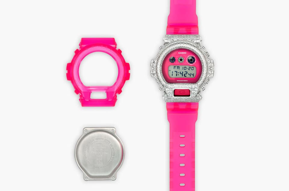 不过Jacob Arabo手上的G-SHOCK来头不小,这款其实是JACOB & Co.改造G-SHOCK的6900系列而来——以G-SHOCK 35周年时发表的Nigo x K.IBE限量款式(DW-6935-4)为基础,把原本就数量稀少的手表升级为顶尖奢华版。表款的表壳以白金制成并镶满了16.5克拉的钻石,底盖则是菲董与Nigo主理潮牌Billionaire Boys Club代表性的太空人图案(此处也有镶钻)。结果再追踪下去,发现这也是Jacob Arabo要提供拍卖的拍品之一,一般6900系列的定价大概是台币2000、3000块,但是JACOB & Co.改装的奢华镶钻版放到拍卖网站的预估价格则是介于12,000~15,000美金(约合台币38万~48万),以G-SHOCK手表而言是相对高的价格,但是它毕竟改用白金表壳又镶了这麼多钻,若能以预估价水准入手,应该会让收藏家大感超值。