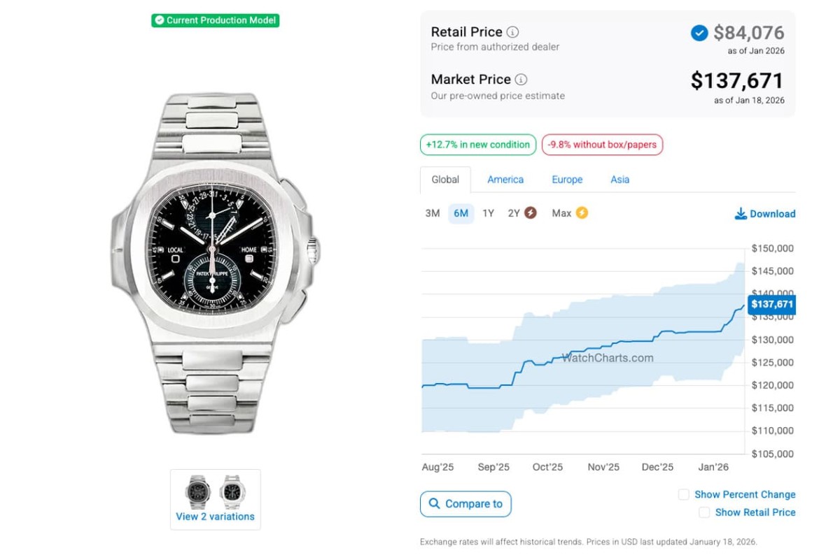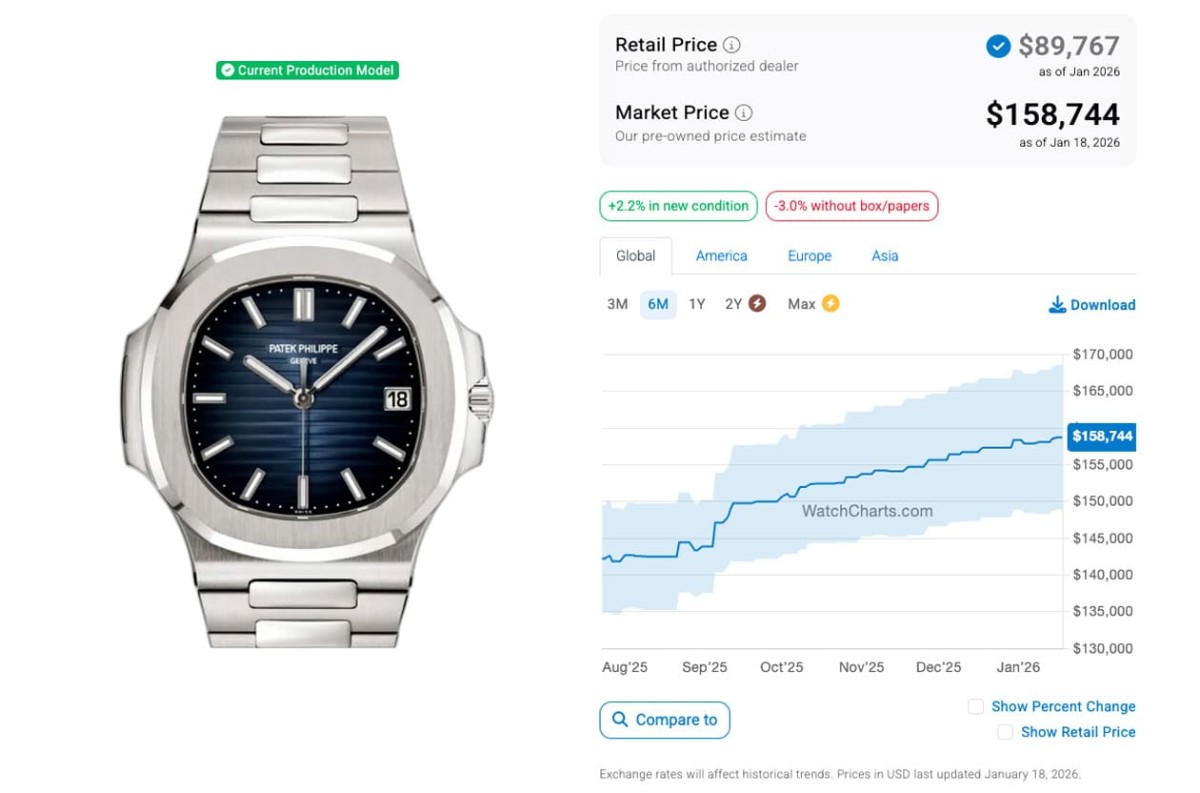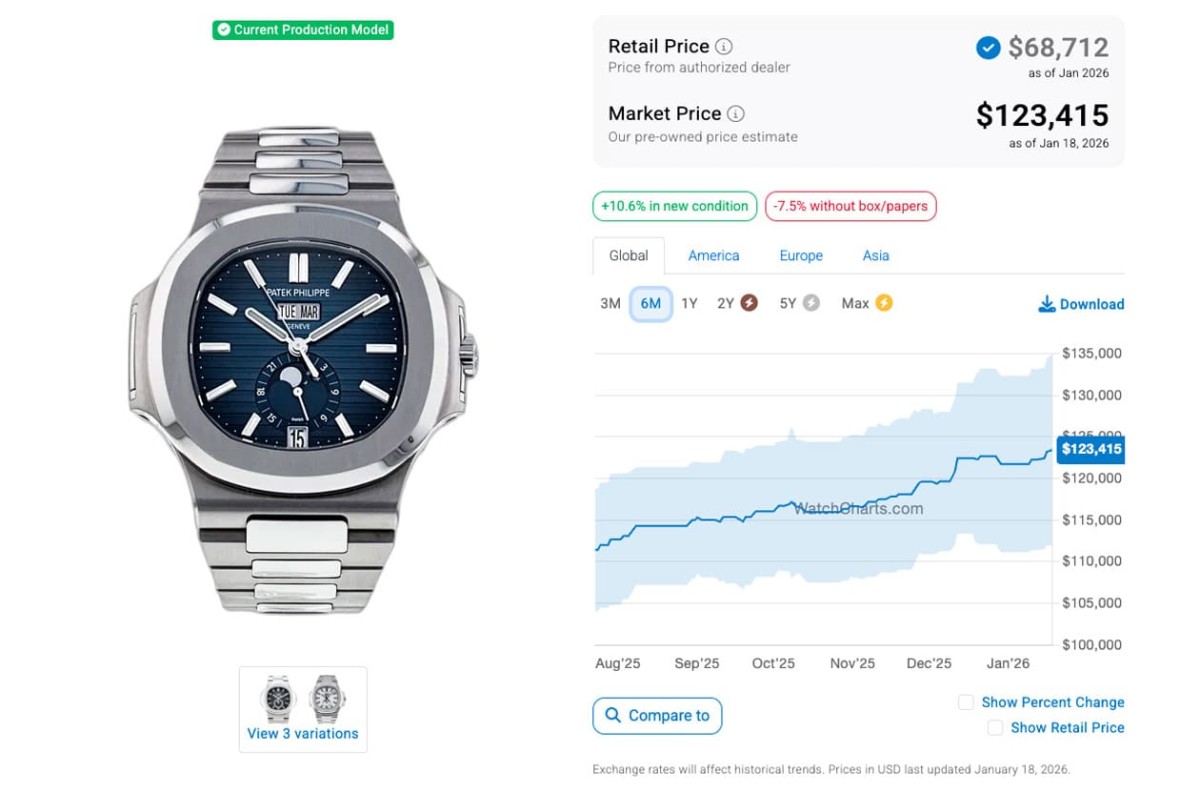 来到2026年1月,距离前述观察期约莫过了半年之久后,同样由WatchCharts网站查找到的行情资料,四款表身价竟都比半年前为高,在行情成长的部分,近期有多款都表现亮眼,例如5726/1A本来在11月~12月身价平平,可是愈到最近反而冲高一波起来,又改写半年来新高的数字,如今的二级市场价格成长至123,415美金(约合台币390万2),而5740/1G在进入到2025年9月后迄今行情也有明显成长,与上个月甚至是半年前都拉出一小段距离,最近行情相当优异,有225,685美金(约合台币713万5)的水准;5811/1G和5990/1A近一个月也持续上涨,身价和上个月相比差异蛮明显的,前者如今最新国外报价是158,744美金(约合台币502万),后者则是137,671美金(约合台币435万2)。