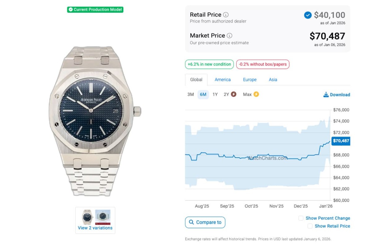 又过了半年到2026年1月,原本16202ST的行情在2025年5月中旬开始有点起色,暂时摆脱3月初的一小段低潮,到6月后又有小涨,使得手表国外二级市场的报价达到半年内的高点,不过接下来到7月又微微往下降了些,而到了8月初曾经一度冲到比6月更高的68,5XX美金,可持续到8月下旬至12月一路微幅跌价并保持相对稳定的发展,结果到了12月下旬,二级市场报价突然窜高升到一年内的巔峰;同样由WatchCharts的资料库中找到的国外市场报价可知,这款表目前的行情成长至70,487美金(约合台币222万7)。回顾2023年12月中旬时这款表价格开始跌破8万5千美金关卡,从那之后至今,16202ST的行情持续往8万美金的那条线靠拢,靠着近期非涨回到7字头左右,戏剧性的发展有点出人意料。即使如此,16202ST还是稳稳的处于超定价境界,以最新的国外报价来计算,手表的溢价率还是有75.7%之多,一只不锈钢二针运动表能够索价200万台币,这真的是要像皇家橡树般的巨星级地位才有可能达到。