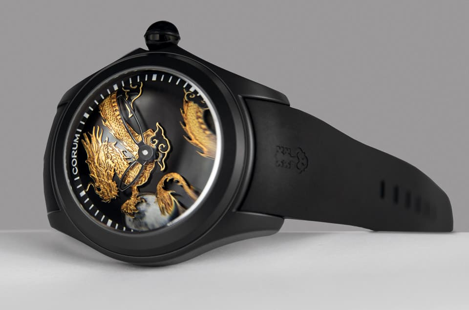 ▲Bubble 47金龙伴月手表在黑漆面盘镶上珍珠母贝月亮与金龙雕刻,将神龙在天空翱翔的姿态捕捉得入木三分。