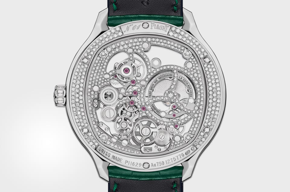 1270D机芯不只镶嵌的钻石数量很多,而且它还是正、反面都镶上钻石;面盘1点方向设有品牌特色的陀飞轮装置,陀飞轮框架造型结合代表伯爵的字母”P”,刚好可以赋予该装置等同于小秒显示的作用,同时9点方向也可见机芯将微型自动盘前置于面盘侧,就连自动盘上也精心镶上9颗梯形切割祖母绿,每当自动盘随着手腕摆动,镂空面盘就会出现迷人的绿色迴圈,让人看得如痴如醉。伯爵为了不让显时作用被埋没在钻石的光芒下,因此也採取将偏心时、分指针镀黑的方式,使其与白钻形成强烈对比,阅读时间因而一清二楚,彻底实践品牌在制表与珠宝领域的专业,并使其完美融合,工艺高度与制作难度完全反映在手表的天价金额上,实属品牌年度一大尖端力作。