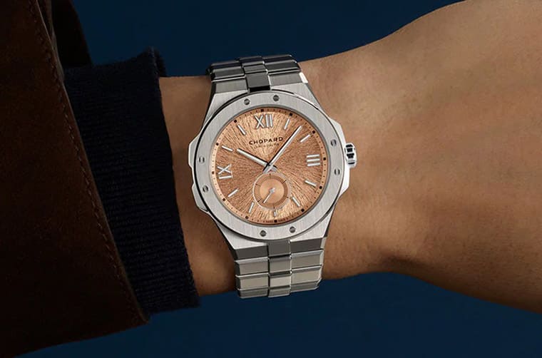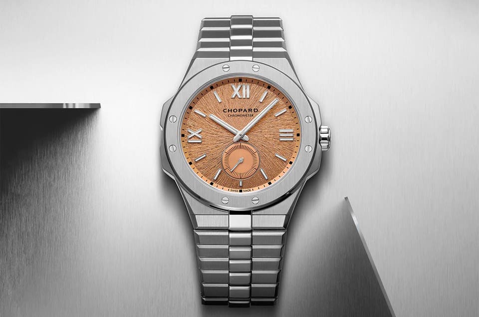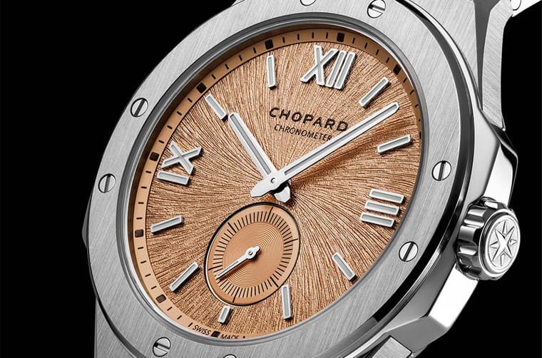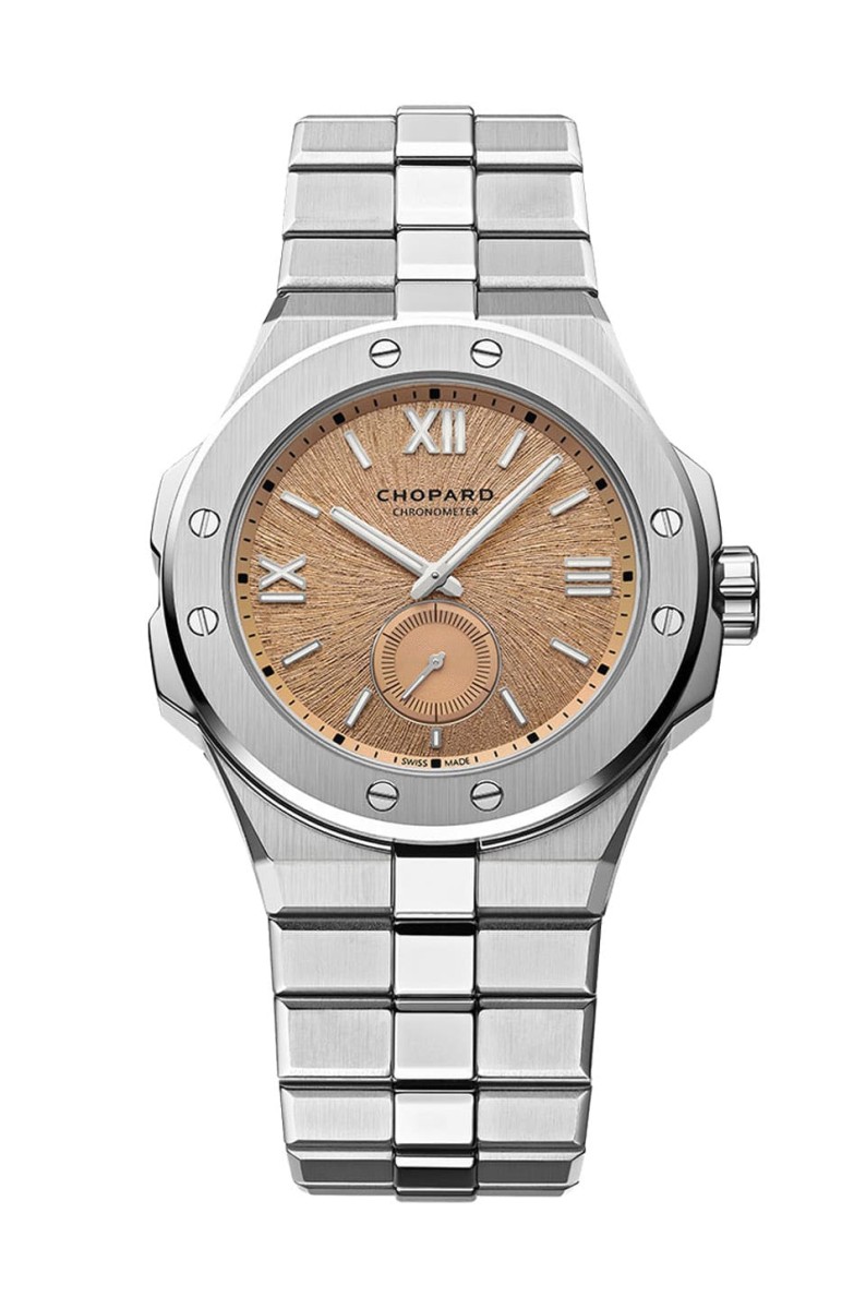表款的面盘由于换上了近年高级品牌时不时常採用的鮭鱼色面盘,使其看起来焕然一新,而且Alpine Eagle 41 XPS内部的机芯已经不同,因此手表的显时模式从大三针主变为小三针,小秒盘就位在6点方向,其内部饰有同心圆纹,和面盘整体的纹路做出区隔,加上小秒盘外围的秒数刻度,使得时间的即时动态可以看得清清楚楚。然而也因为换过机芯的关系,因此手表的日期显示也被移除,从这些功能与面盘格局的细节变化,可以辨识Alpine Eagle 41是否属于搭载超薄机芯的版本。至于这系列另外一个特徵,自然就是鮭鱼色面盘底下的特色纹路,其灵感是源自雄鹰的虹膜,实际上品牌用纤细的放射状纹理来诠释,如此富有生命力的设计,让手表看起来别具活力,搭配矩形与罗马数字交错的时标,勾勒出一个高级运动表的理想样貌。