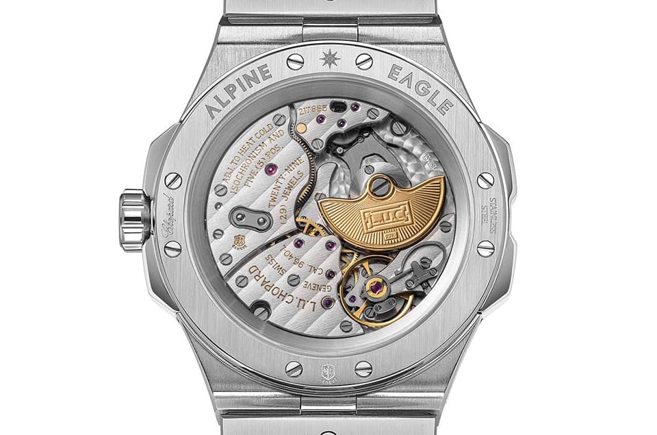 手表搭载的L.U.C 96.40-L机芯配置了微型自动盘,使得机芯厚度可以降低至3.3mm,比Alpine Eagle 41搭载的全幅机芯01.01-C(厚度为4.95mm)纤薄许多,L.U.C机芯出自萧邦的高级机芯工坊,其蕴含的工艺水准属于品牌的优等生,包括机芯零件的打磨与规格都比01.01-C有更上层楼的演出,而且L.U.C 96.40-L机芯具备萧邦专利的Twin技术串联双发条盒,动力储存65小时也比01.01-C稍微多一些,另外还有一点不可不提的是,L.U.C 96.40-L机芯除了通过瑞士天文台认证,它同时也拿到日内瓦印记,从工艺面以及机芯品质等不同层面,Alpine Eagle 41 XPS都能算是系列中的菁英份子,这也让手表的透背设计更有看头。